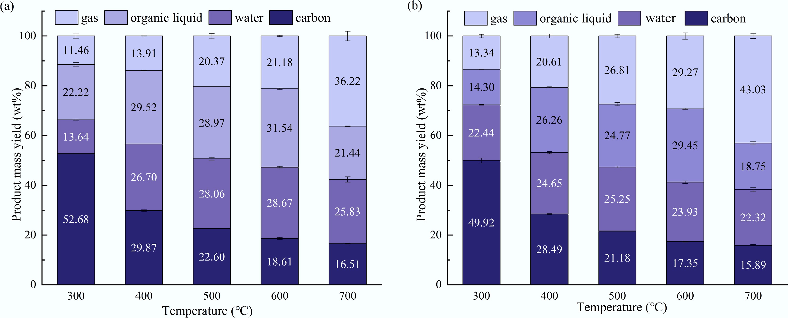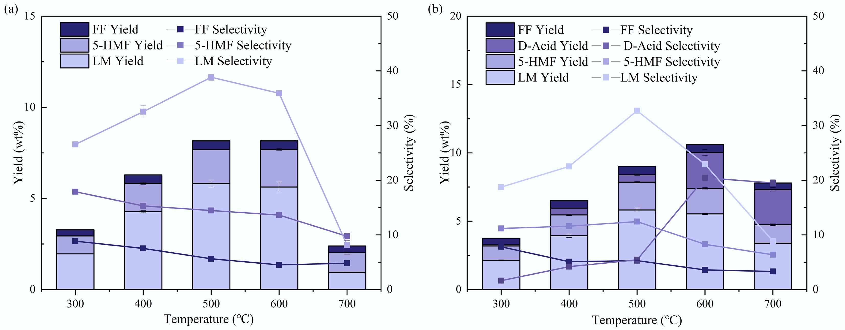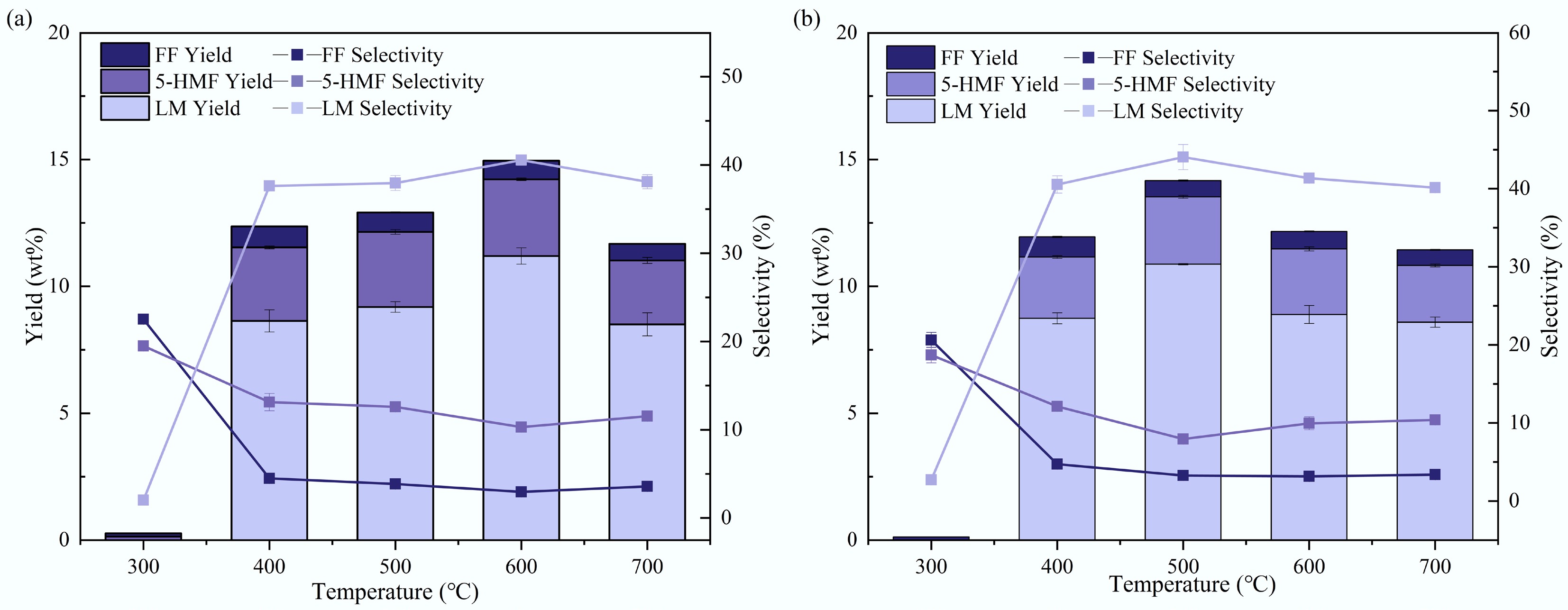 The yields and selectivity of these major products are shown in Fig. 6. At 300 °C, there are almost no pyrolysis products, so the selectivity has no practical significance. When the temperature reaches 400 °C, a large number of pyrolysis products begin to appear, and their total yield shows a trend of increasing first and then decreasing as the temperature rises from 400 to 700 °C. Further temperature increases had little influence on the product distribution.