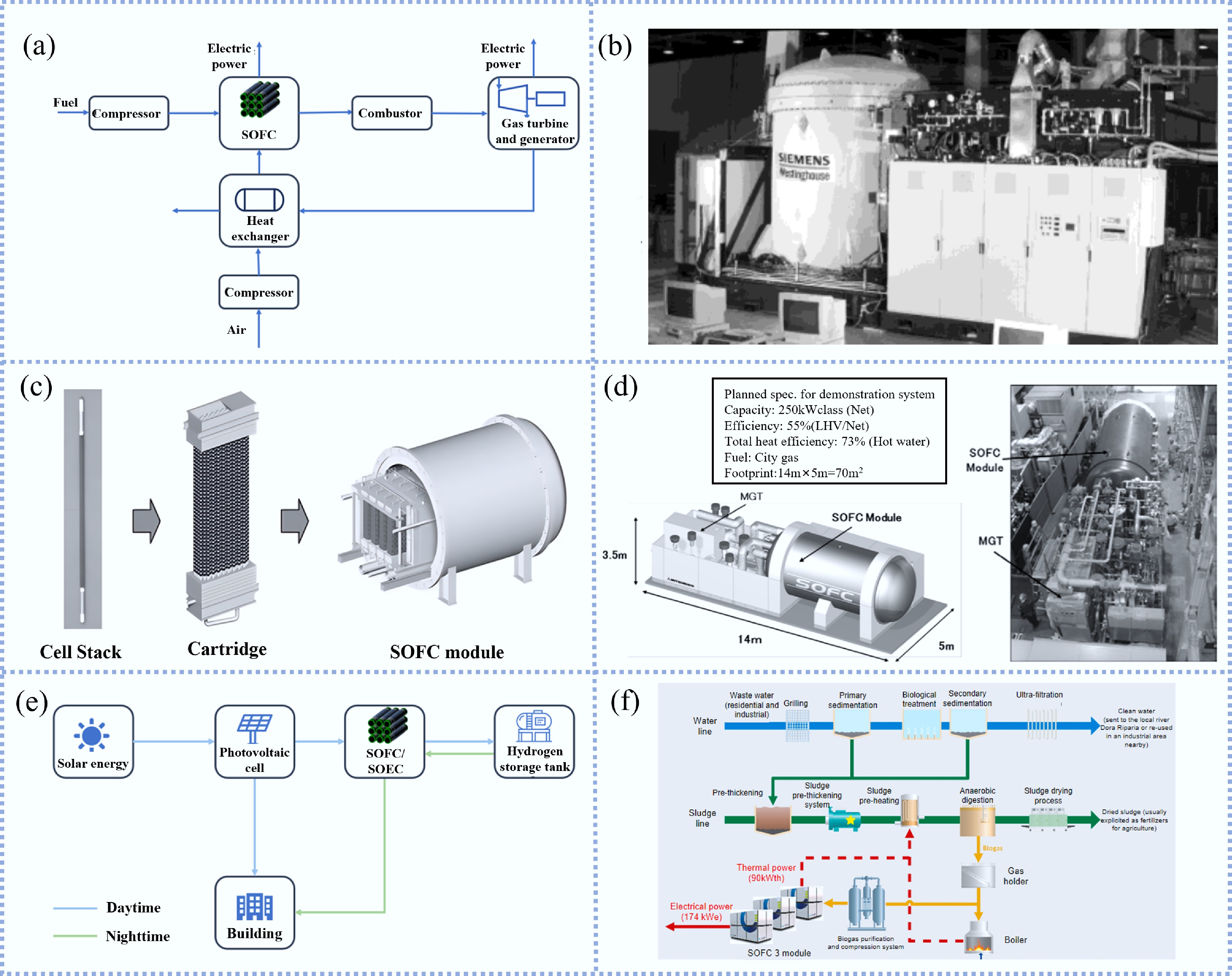 (a) Schematic diagram of a pressurized SOFCs-GT system. (b) 220 kW SOFCs-GT system without the power dissipators[19]. (c) SOFC module developed by MHI[127]. (d) 250 kW SOFCs-GT system was developed by MHPS[66]. (e) Schematic diagram of a system combining SOFCs and photovoltaics. (f) Layout of wastewater treatment plant with SOFCs[128].