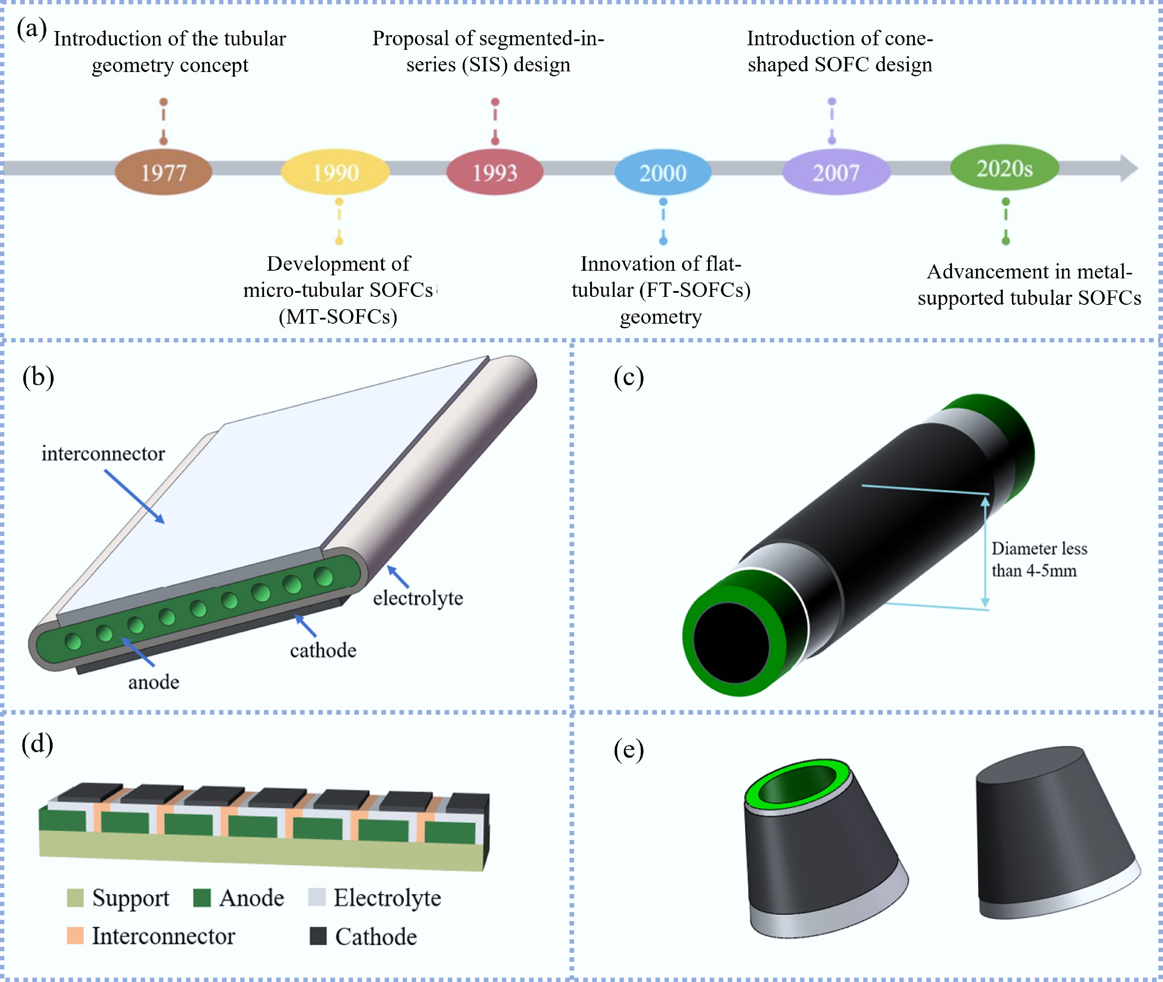 (a) Timeline for the development of various tubular SOFCs[4,2527]. (b) Schematic diagram of the FT-SOFC. (c) Schematic diagram of the MT-SOFC. (d) Schematic diagram of the SIS-SOFC. (e) The schematic diagram of the cone-shaped SOFC.