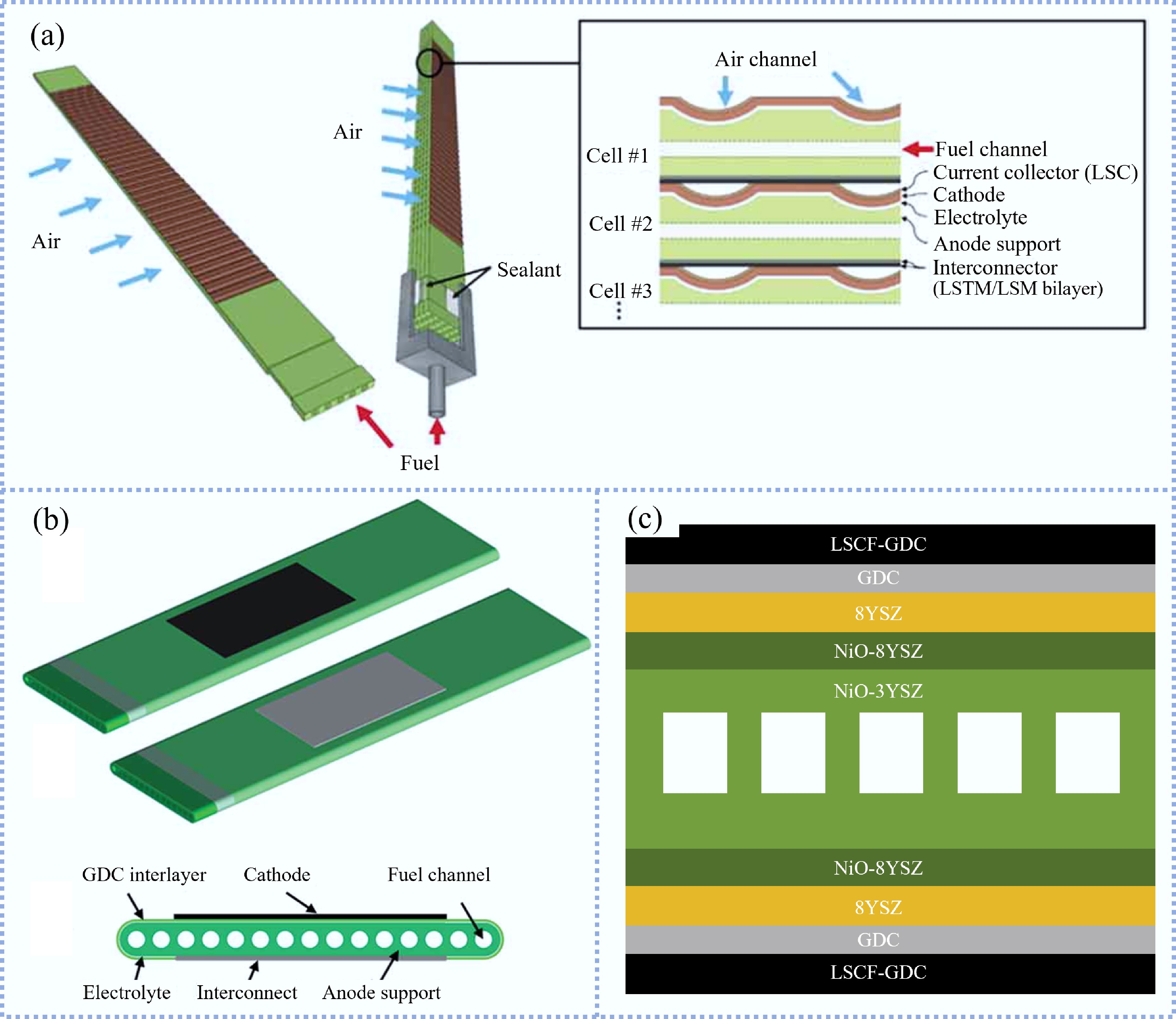 (a) Schematic diagram of the FT-SOFC integrated electrode and air channel[29]. (b) Schematic diagram of the FT-SOFC[29]. (c) Schematic diagram of the symmetrical FT-SOFC.