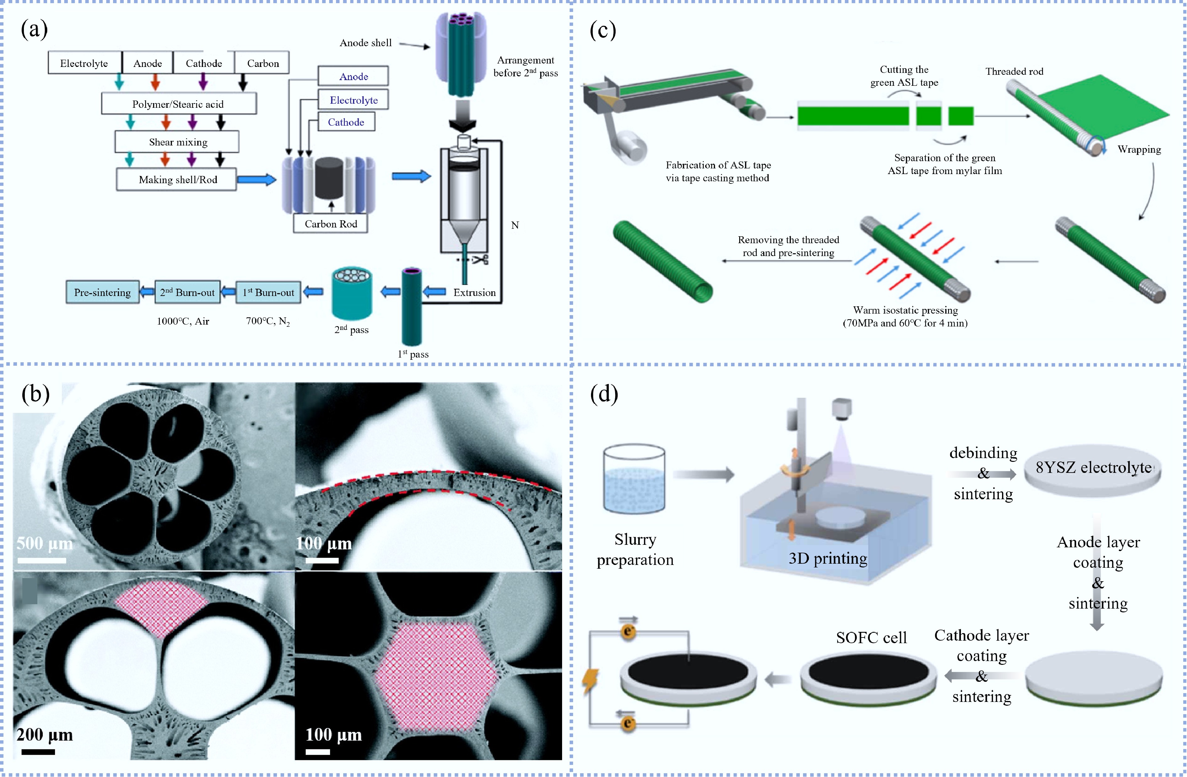 (a) Fabricating process of multi-tubular SOFC with seven cells[78] (Reprinted with permission from Mani et al.[79]. Copyright [2010] Elsevier B.V.). (b) SEM photomicrographs of 6-channel anode supports[22]. (c) Fabrication steps of anode support bolt-microtube[83] (Reprinted with permission from Kim & Jang[84]. Copyright [2023] Elsevier B.V.). (d) Schematic of 3D printed MT-SOFC fabrication process[84].