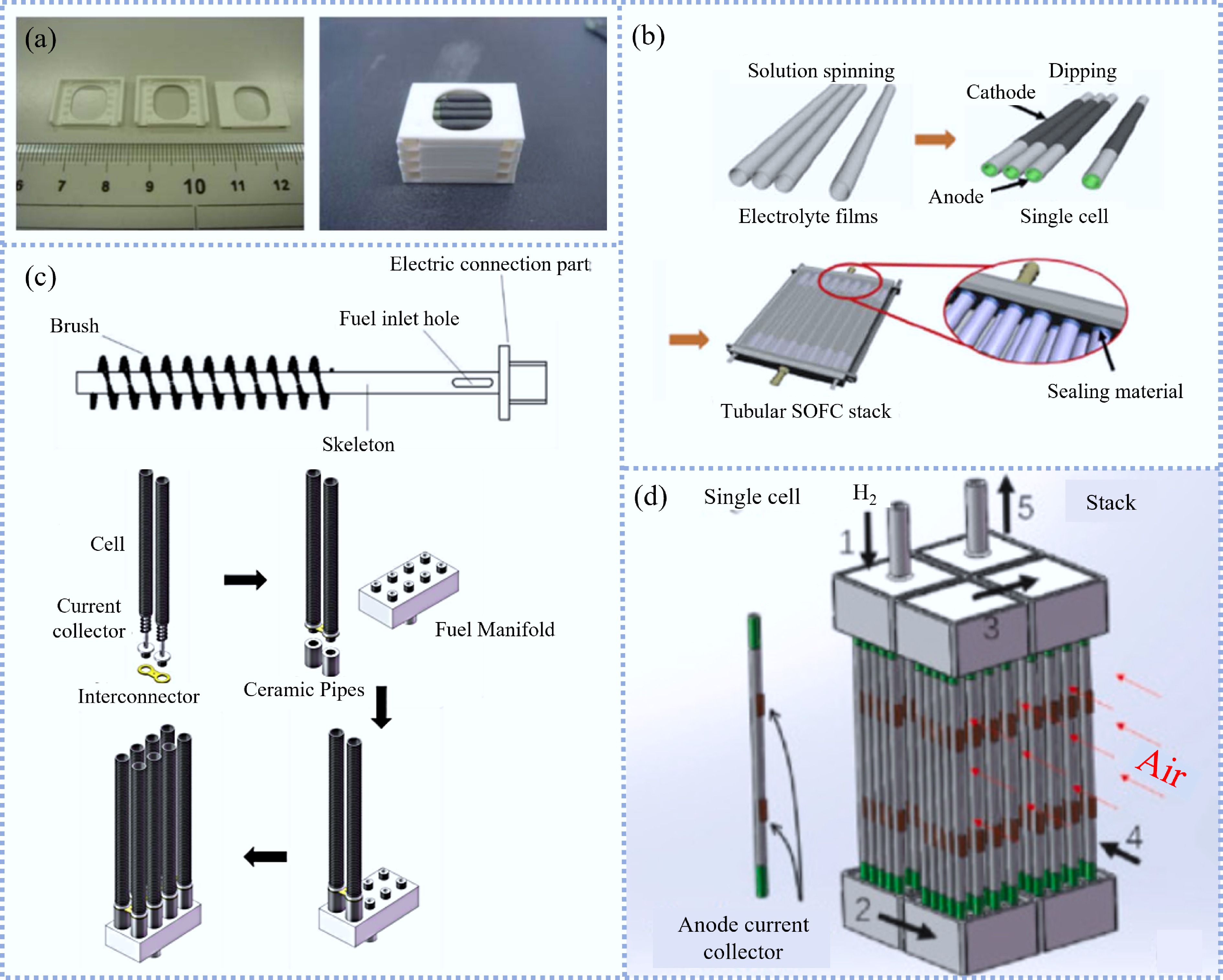 (a) Actual images ceramic manifold components and micro-tubular SOFC stacks consisted of four bundles[94]. (b) Fabrication process of the MT-SOFC stack Using MgO matrices[61]. (c) Schematic diagram of the current collector and the assembly process of the eight-cell stack[98]. (d) Actual images of the MT-SOFC with double Ni-pads and the schematic diagram of the MT-SOFC stack consisting of 80 cells[99].