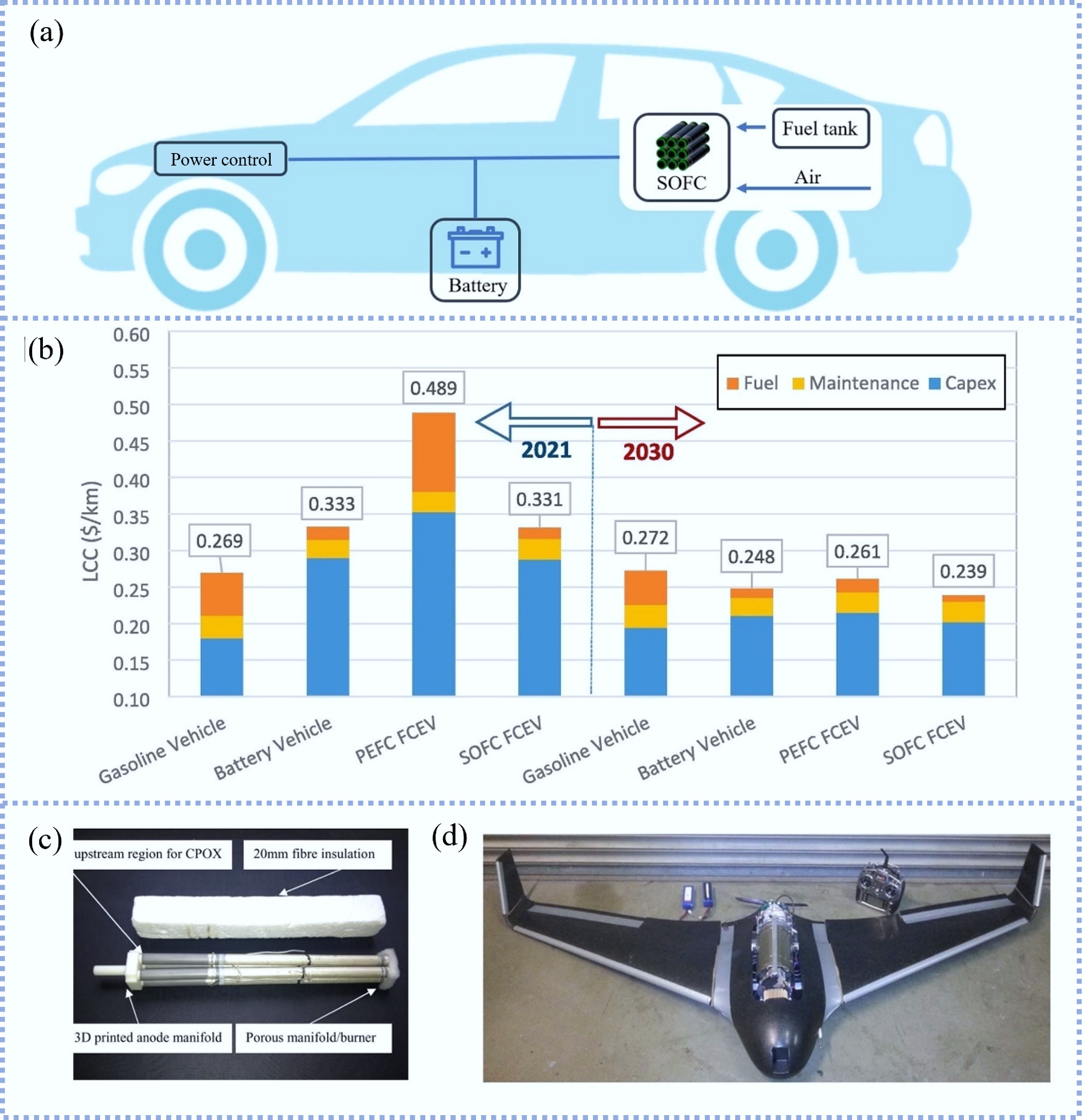 (a) System diagram of SOFCs-battery hybrid vehicle. (b) Life cycle costs of different vehicles[106]. (c) MT-SOFCs stack for the UAV. (d) Actual images of UAV equipped with MT-SOFC system[107].