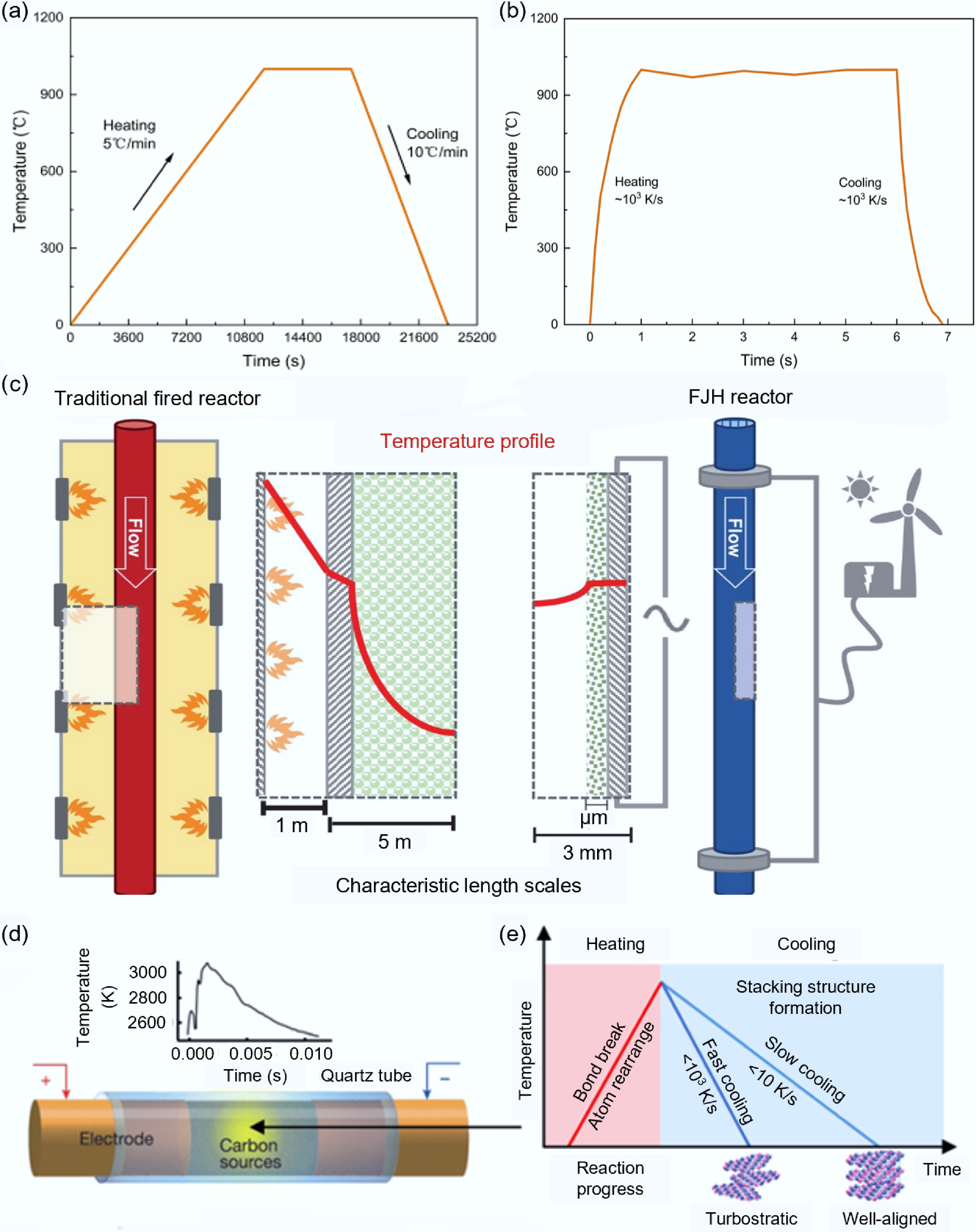 Flash temperature. The temperature during the flash process is closely related to the regulation of pore structure. The structure of the pores directly affects the performance of the energy storage material. Small pores can provide many active sites for energy storage, while medium-sized and large pores are conducive to the transmission and storage of electrolyte ions[83]. Shen et al.[84] used FJH to perform high-temperature modification on methane pyrolyzed carbon black. When the temperature increased from 1,100 to 1,700 °C, the carbon black was restructured from a non-porous structure to a porous structure. However, when the temperature rose to 2,000 °C, the pores inside the carbon black particles began to shrink. As the temperature of the carbon black thermal treatment increased, the orderliness of the carbon black enhanced, so the sample at 2,000 °C had the most stable electrochemical performance (only dropping 18.31% at an extreme current load of 20 A/g), but its surface pores closed, resulting in a lower specific capacitance (7.65 F/g) (less than 11.34 F/g of the sample at 1,700 °C). Qiu et al.[85] developed a closed-pore regulation strategy based on preheating treatment and FJH for biomass-derived hard carbon. This significantly improved the performance of the hard carbon anode material (up to 93.3% initial Coulombic efficiency and 377 mAh/g reversible capacity). The preheating treatment constructed an ultra-microporous structure, converting cellulose into a high-carbonization-capable framework, thereby increasing the final yield of biomass-derived hard carbon. On this basis, FJH treatment rapidly generated abundant closed-pore structures, and by expanding the interlayer spacing, it provided efficient transmission channels for sodium ions (as shown in Fig. 8e).