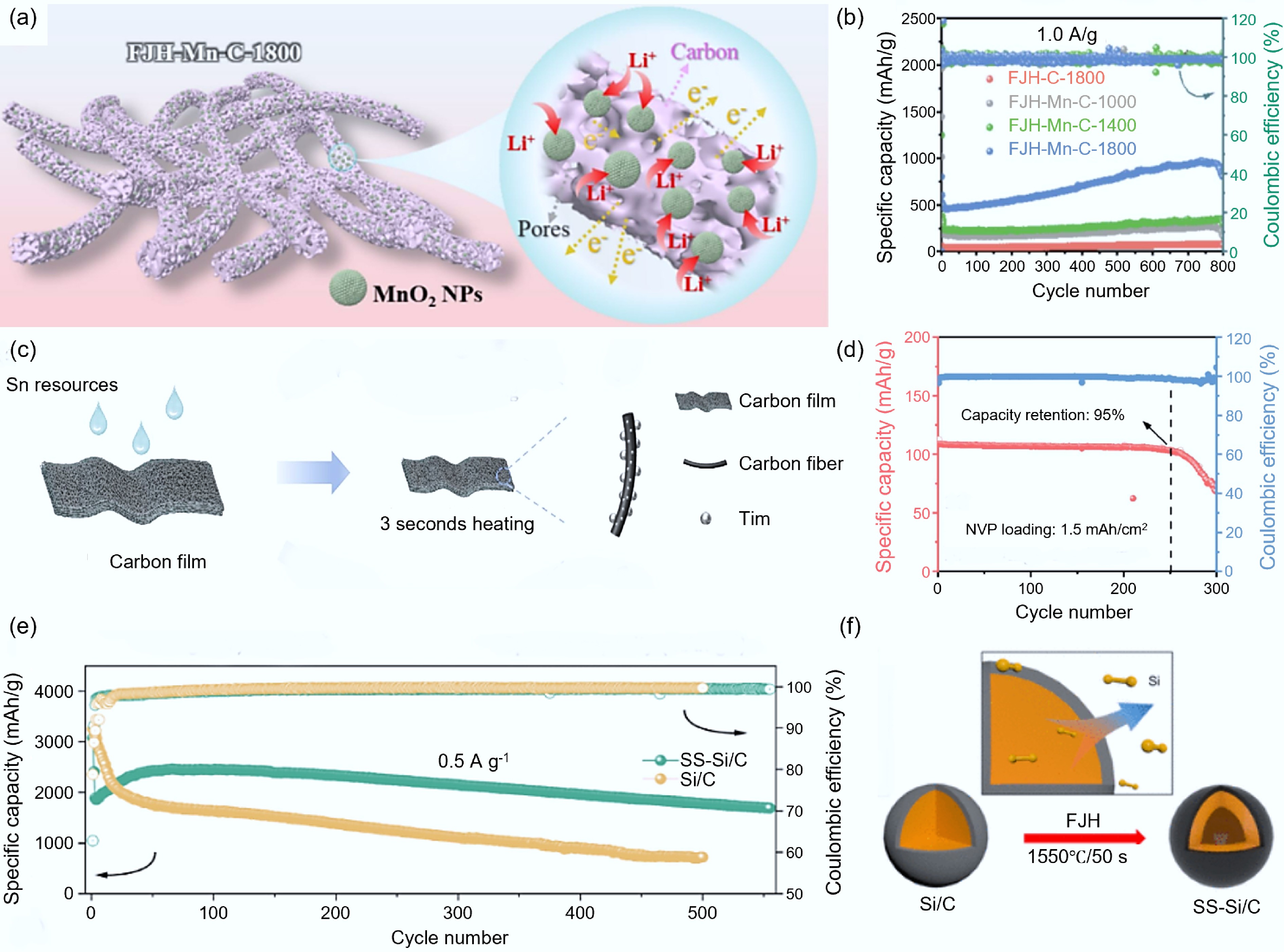 Metallic oxide. Metal oxides (such as MnOx, NiO, etc.) provide redox active sites, and when combined with carbon materials, they can alleviate the problem of low conductivity. Their high theoretical capacity[103] and pseudo-capacitive properties[104] are often used as one of the ideal electrochemically active materials. Deng et al.[104] reported the MnO2/carbon composite material synthesized by FJH (FJH-Mn-C) (as shown in Fig. 10a). For lithium-ion batteries, after testing, the FJH-Mn-C-1800 electrode performed the best at 1,800 °C (at a current density of 1 A/g, it could maintain a stable capacity of 570.9 mAh/g after 400 cycles, and the Coulombic efficiency was as high as 97.8%) (as shown in Fig. 10b). Andreu et al.[105] synthesized nickel sulfides and nickel oxide nanoparticles (Ni3S2-NiO@BP) on the carbon nanotube substrate (buckypaper, BP) via FJH, and applied them as an electrode material for high-performance flexible supercapacitors. They demonstrated an extremely high specific capacitance of 2,278 F/g at a current density of 1 A/g, and still maintained 1,080 F/g even at a high current density of 10 A/g.