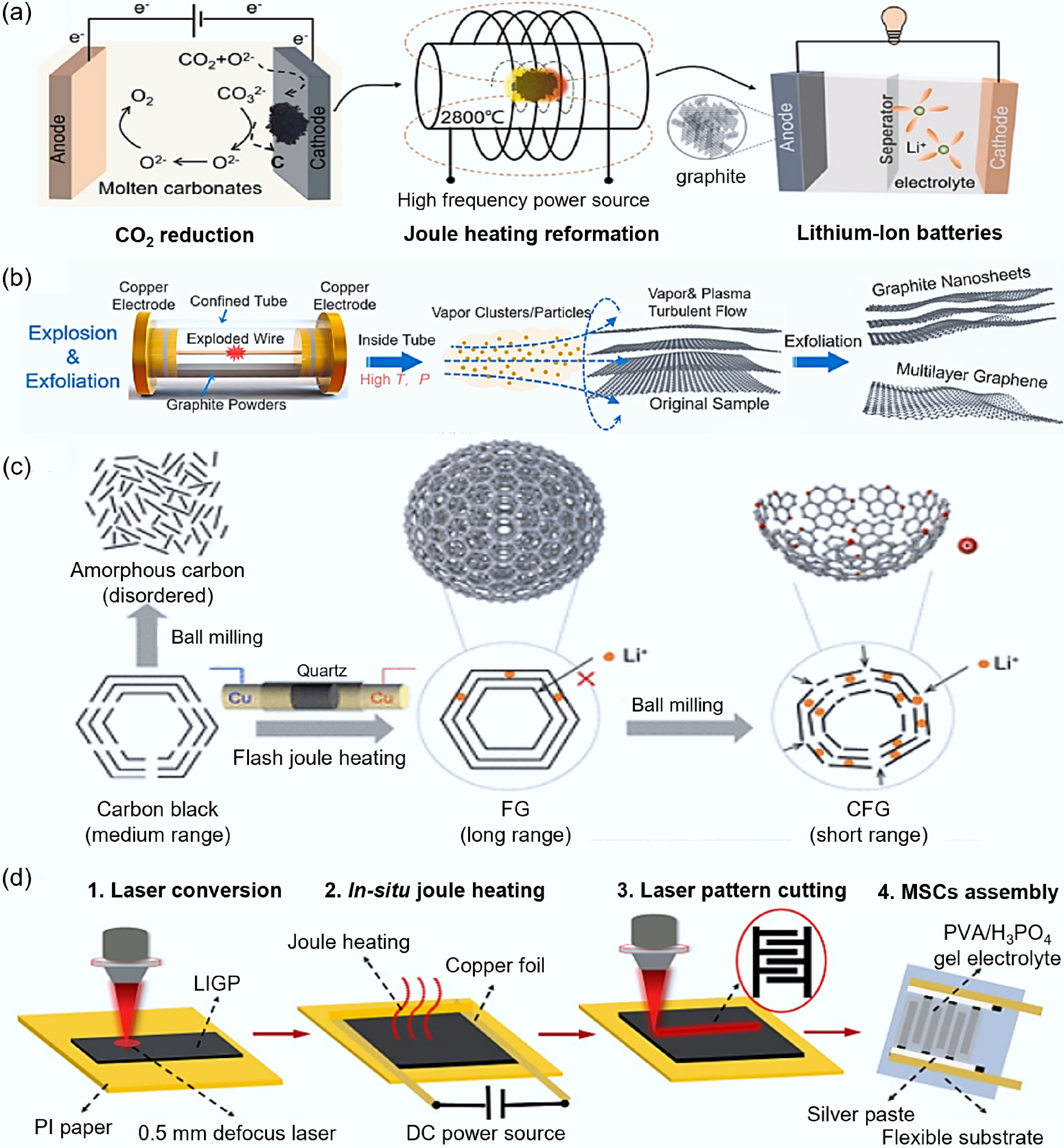 • Coupling FJH with other methods to optimize the reaction process provides a new research approach for the synthesis of high-performance carbon-based electrode materials. Han et al.[113] coupled FJH with the rapid molten salt method, obtaining porous carbon materials with a surface area of up to 1,338 m2/g, which presented excellent (284.6 F/g) specific capacity in an alkaline KOH electrolyte. The symmetrical supercapacitor assembled with TEBAF4/AN electrolyte had a specific energy of 43.9 Wh/kg at 375 W/kg and showed good cycle stability, retaining 90.1% capacity after 10,000 cycles. Wang et al.[114] used FJH combined with molten salt electrolysis of carbon dioxide to synthesize graphite materials (as shown in Fig. 11a), and the graphite anode showed excellent reversible capacity (297.7–378.1 mAh/g) and initial Coulombic efficiency (72.6%–80.5%). Chen et al.[115] coupled FJH with steam activation to synthesize high-graphitized porous carbon foam (as shown in Fig. 11b), which demonstrated a capacity of up to 516.2 mAh/g in lithium-ion battery tests and maintained 92.77% capacity after 1,100 cycles, significantly exceeding the theoretical capacity of traditional graphite. Deng et al.[116] coupled FJH with spheroidal graphite technology (as shown in Fig. 11c), achieving gram-scale production of graphene and regulating its structural properties. The cracked graphene (CFG) after spheroidal graphite treatment exhibited significantly better capacity and rate performance than traditional materials, maintaining a high capacity of 99% at the 500th cycle, and with a charging state of 77% and 62% when assembled with LiFePO4 (LFP) cathode in a 2 and 4 C condition, respectively. Luo et al.[117] introduced the assembly of FJH combined with laser-induced graphene paper-based micro-supercapacitors (LIGP-MSC) (as shown in Fig. 11d), significantly increasing the specific surface area (from 160.97 to 533.49 m2/g) and pore volume (from 0.179 to 0.553 cm3/g) of laser-induced graphene. These structural changes led to a significant improvement in the capacitance performance of LIGP-MSCs, achieving an area-specific capacitance of 13.71 mF/cm2 at a scan rate of 10 mV/s, which is six times that of unheated LIGP-MSCs. Apart from molten salt and laser-assisted processes, other synergistic effects of other electric heating methods like microwave and induction should also be considered. We had previously discussed the issues regarding the removal of adhesives and residual electrolytes for the recycling of waste graphite anodes[118]. Microwave heating, due to its strong microwave absorption capability, can assist FJH in rapidly heating the waste graphite particles, promoting the decomposition of the binders and residual electrolytes, thereby facilitating the efficient detachment from the copper foil. Fan et al.[119] utilized microwave-assisted FJH to recover and regenerate waste anode graphite. The regenerated graphite retained an ordered layered structure and restored electrochemical activity. The initial discharge specific capacity and coulombic efficiency at 0.1 C were 435.2 mAh/g and 80.6%, respectively.