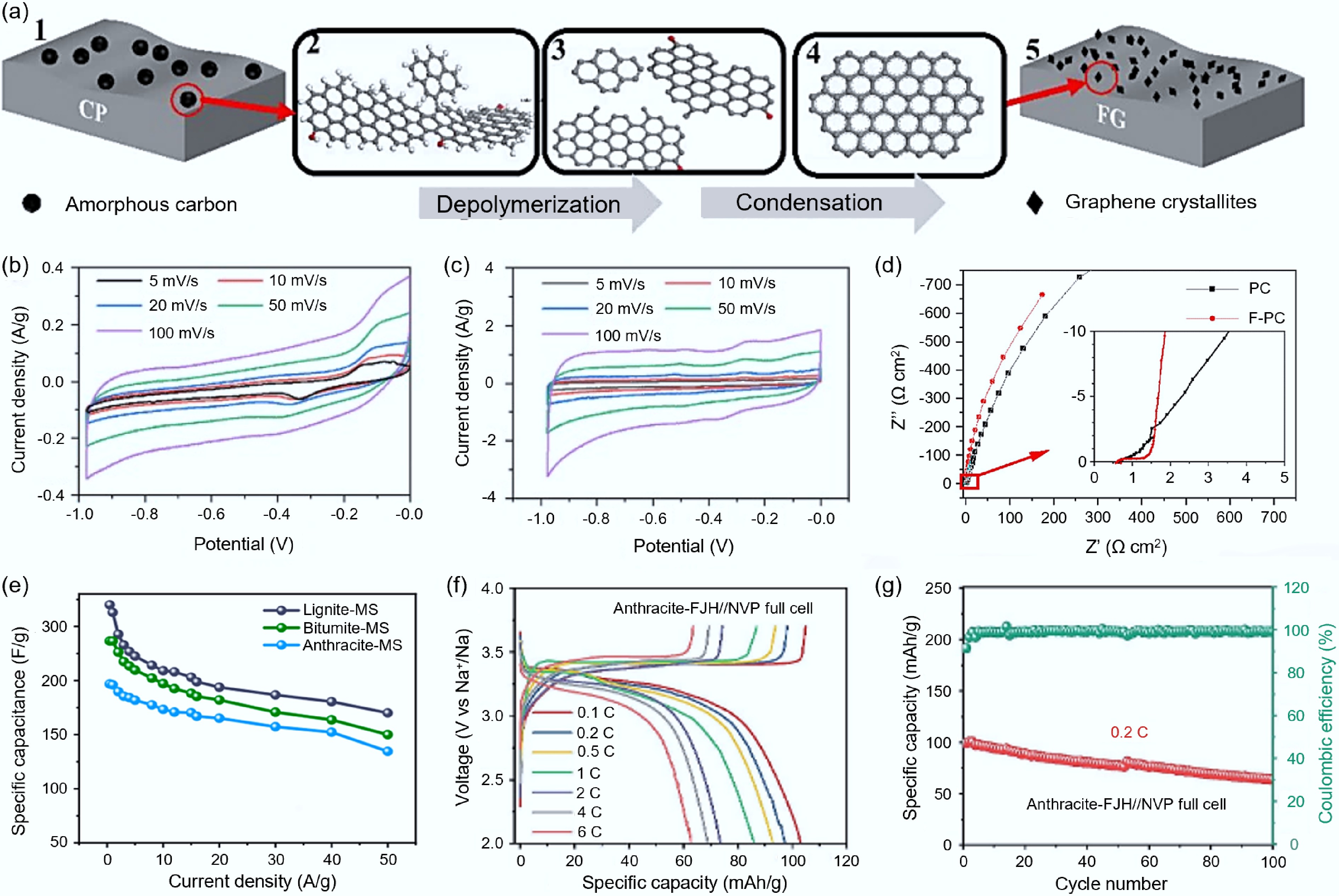Synthesis of carbon-based electrode materials from fossil fuels via FJH. (a) Schematic diagram of the formation mechanism of coal-based-FG[41]. (b) CV curve of the supercapacitor battery assembled with PC[41]. (c) CV curve of the supercapacitor battery assembled with F-PC[41]. (d) Nyquist plots of PC and F-PC[41]. (e) Specific capacitance of carbon materials synthesized from lignite, bituminous coal, and anthracite at different current densities[44]. (f) CD spectrum of all batteries assembled with Na3V2(PO4)3 positive electrode and graphite from anthracite at different rates[45]. (g) Cycling performance of all batteries assembled with Na3V2(PO4)3 positive electrode and graphite from anthracite at 0.2 C[45].