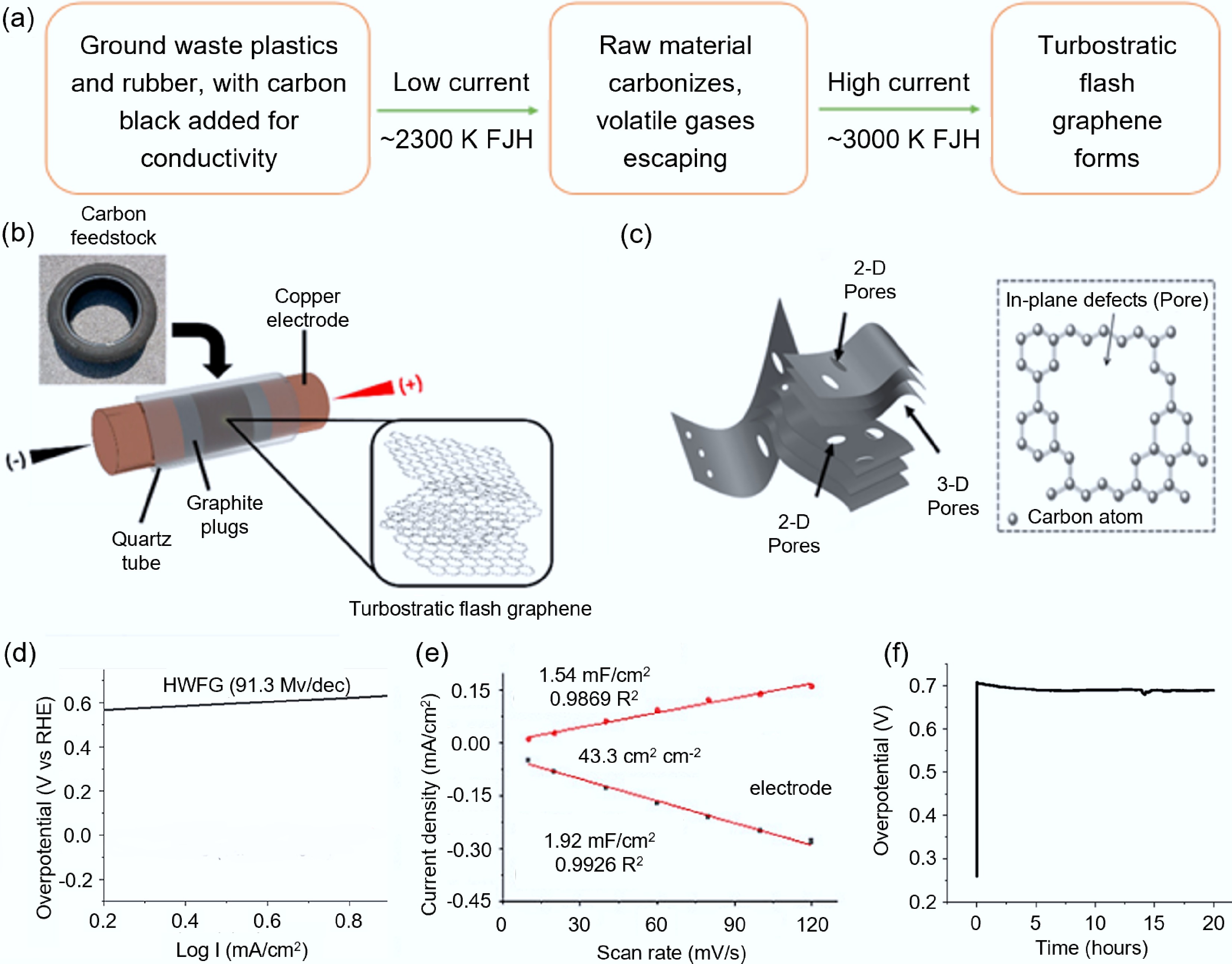 Unlike rubber, the plastic raw materials treated by FJH can usually be synthesized into Holey & Wrinkled Flash Graphene (HWFG) with porous and wrinkled structures, as shown in Fig. 3c. During this process, high temperature of FJH process induces both physical and chemical activation effects, which not only stabilize the porous carbon framework but also promote the formation of high specific surface area, ultimately resulting in high-quality HWFG[55]. Compared to general FG materials (with a specific surface area of approximately 295 m2/g and pores mainly consisting of micropores and mesopores)[14], HWFG has a higher specific surface area (650–874 m2/g) and a wider pore size distribution, covering micropores, mesopores, and macropores. This unique pore structure and surface functional group characteristics enable HWFG to present excellent stability and high discharge rate performance in lithium metal battery anodes. The result of James M. Tour's research team[55] indicated that, when HWFG was used as the negative electrode, the Tafel slope was 91.3 mV/dec, indicating its efficient charge exchange ability; the electrochemically active area of the electrode reached 43.3 cm2. In a 20-h long cycle test, the overpotential of the electrode only increased by 19 mV at a current density of 20 mA/cm2, demonstrating excellent electrochemical stability (Fig. 3df).