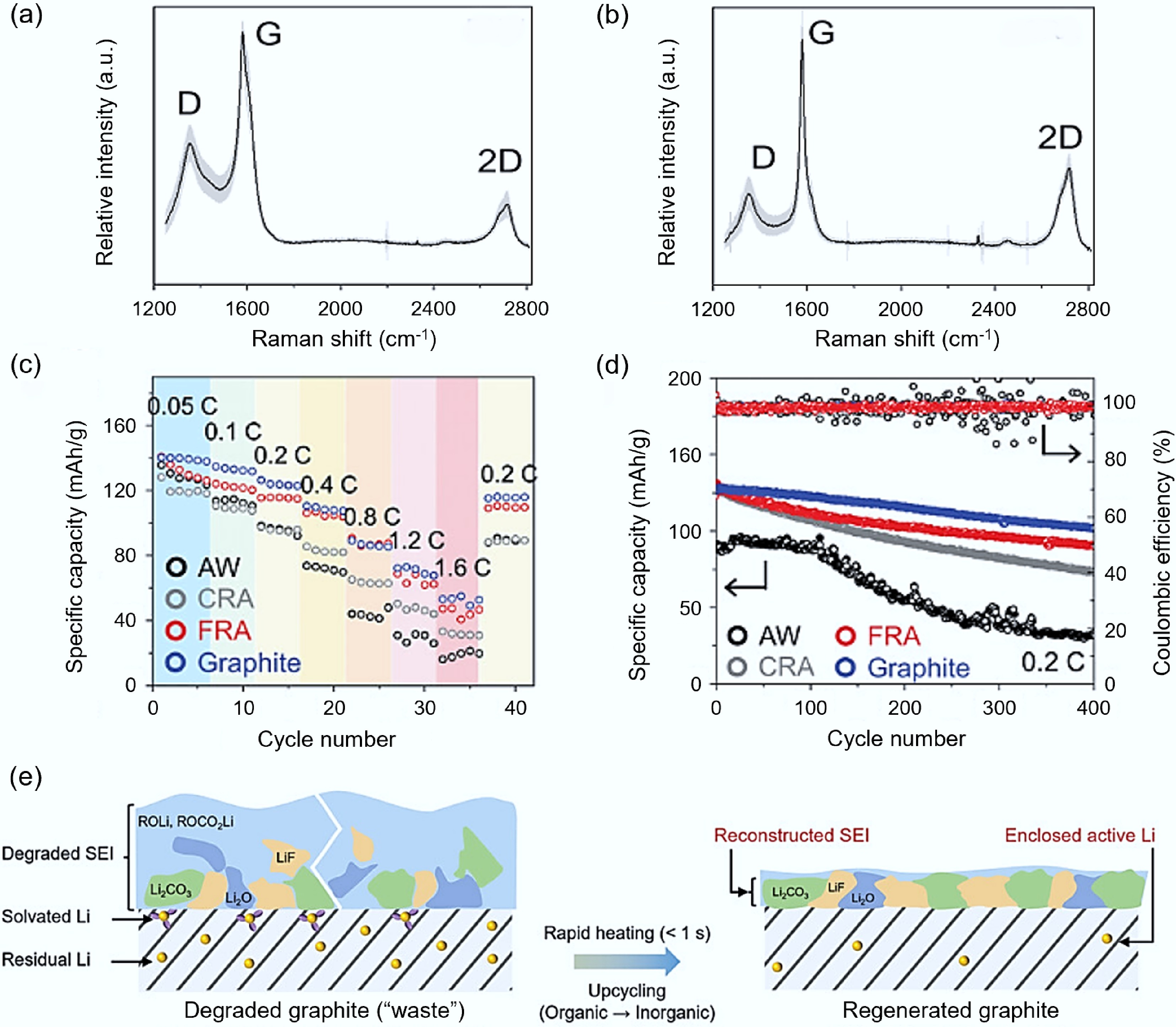 The waste graphite anode regenerated by FJH has significant advantages in terms of structure and electrochemical performance compared to the traditional calcination treatment method. The research team of James M. Tour[60] directly treated the used graphite anode with FJH and compared it with the ordinary calcination treatment. The results showed that the average ID/G and I2D/G strength ratios of the rapidly regenerated graphite were 0.14 and 0.56, respectively, while the values of the calcined regenerated graphite were 0.29 and 0.44 (as shown in Fig. 4a, b), which indicated that the rapid regeneration method can maintain the original structure of the graphite and avoid the formation of defects. The specific capacity of the negative electrode regenerated by FJH (FRA) was significantly higher than that of the untreated waste graphite electrode (AW), although the specific capacity of the calcined recovered negative electrode (CRA) was similar to that of FRA and commercial graphite at low rates (< 0.2 C), but at high rates, the specific capacity of CRA significantly decreased and the overpotential increased (as shown in Fig. 4c). The specific capacity of AW was relatively low, approximately 94.9 mAh/g, with poor stability. After 400 cycles at 0.2 C, the average capacity decay per cycle was 0.17% for AW. The specific capacities of FRA and CRA were 131.1 and 129.8 mAh/g, respectively. However, the electrochemical stability of FRA was better, with a per-cycle decay of 0.078% (as shown in Fig. 4d).