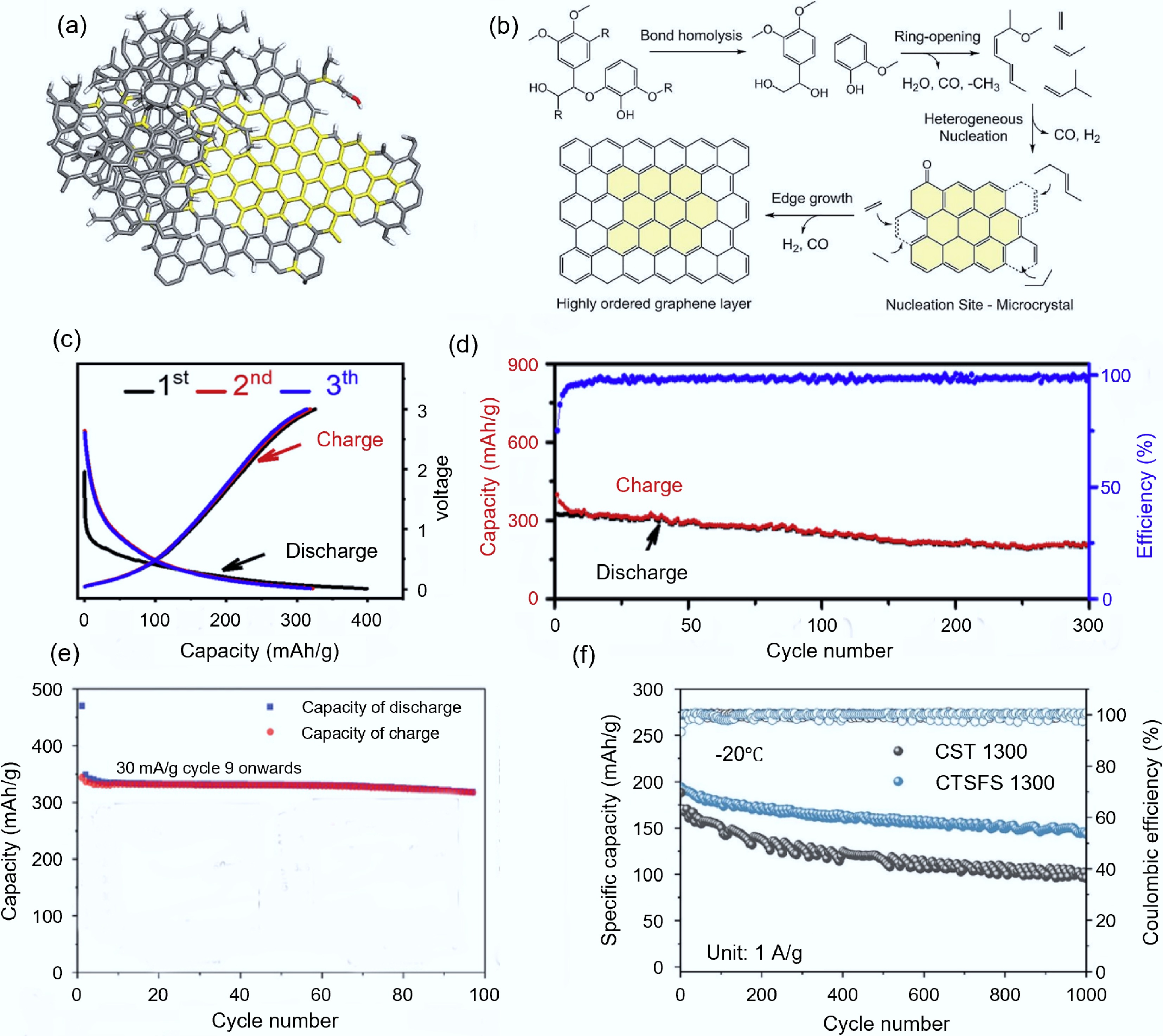 Synthesis of carbon-based electrode materials from biomass via FJH. (a) Structure diagram of LFG[69]. (b) Mechanism of lignin graphitization[69]. (c) Cycling performance and Coulombic efficiency of LFG transformed from agricultural and forestry residues[72]. (d) Constant current charge-discharge curve of LFG materials[68]. (e) Constant current charge-discharge curve of GH materials[74]. (f) Cycling performance of CTS-1300 and CTSFS-1300 at −20 °C[76].