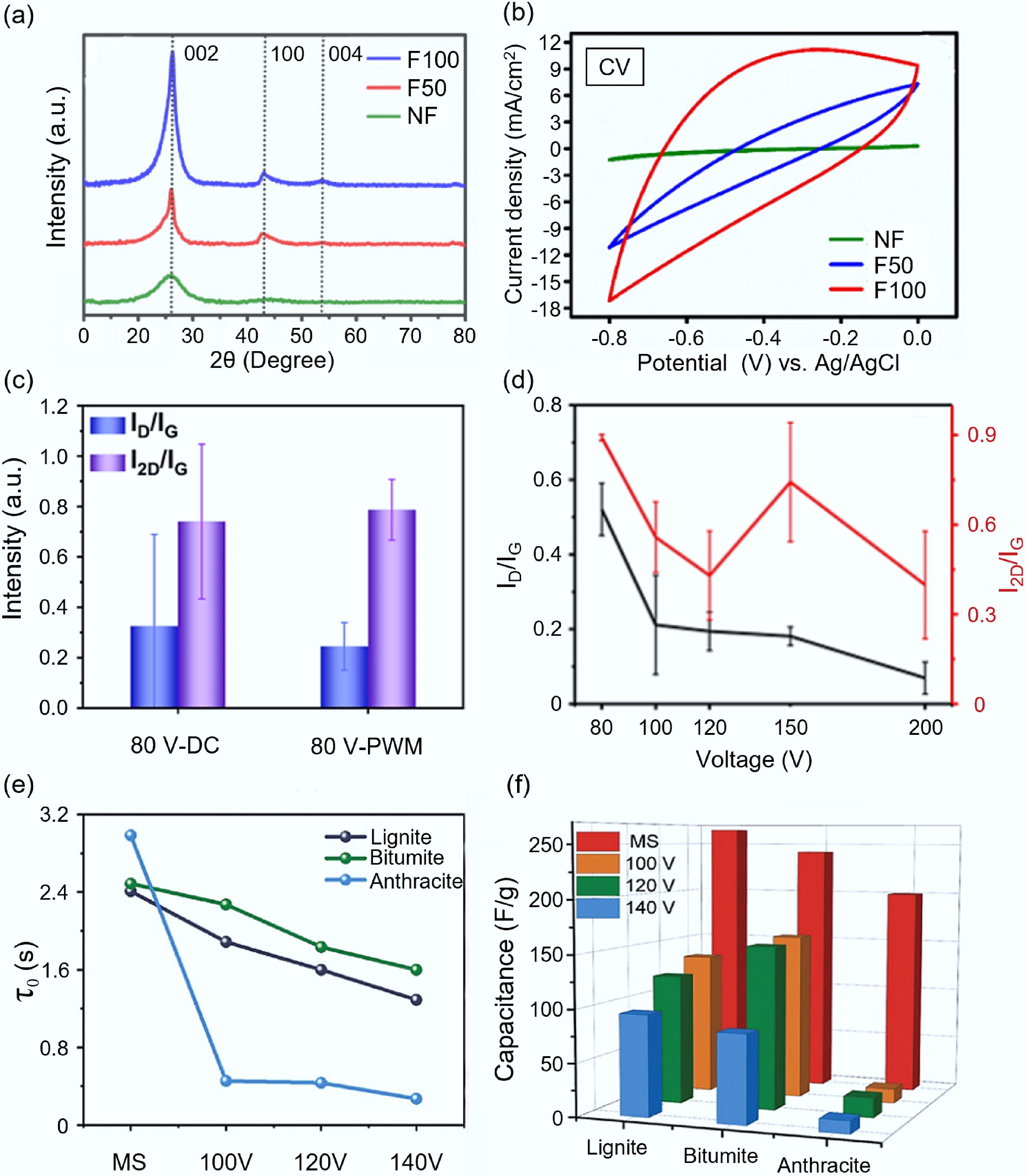 The influence of electrical parameters on the synthesis of carbon-based electrode materials by FJH. (a) XRD patterns of graphene products under different voltages[77]. (b) CV curves of NF, F50, and F100 electrodes compared at 100 mV/s[77]. (c) The influence of PWM and DC on the structure of graphite products[79]. (d) The effect of flash voltage on the structure of carbon products[72]. (e) The impact of flash voltage on the relaxation time of carbon products[44]. (f) The influence of flash voltage on the specific capacitance of carbon products[44].