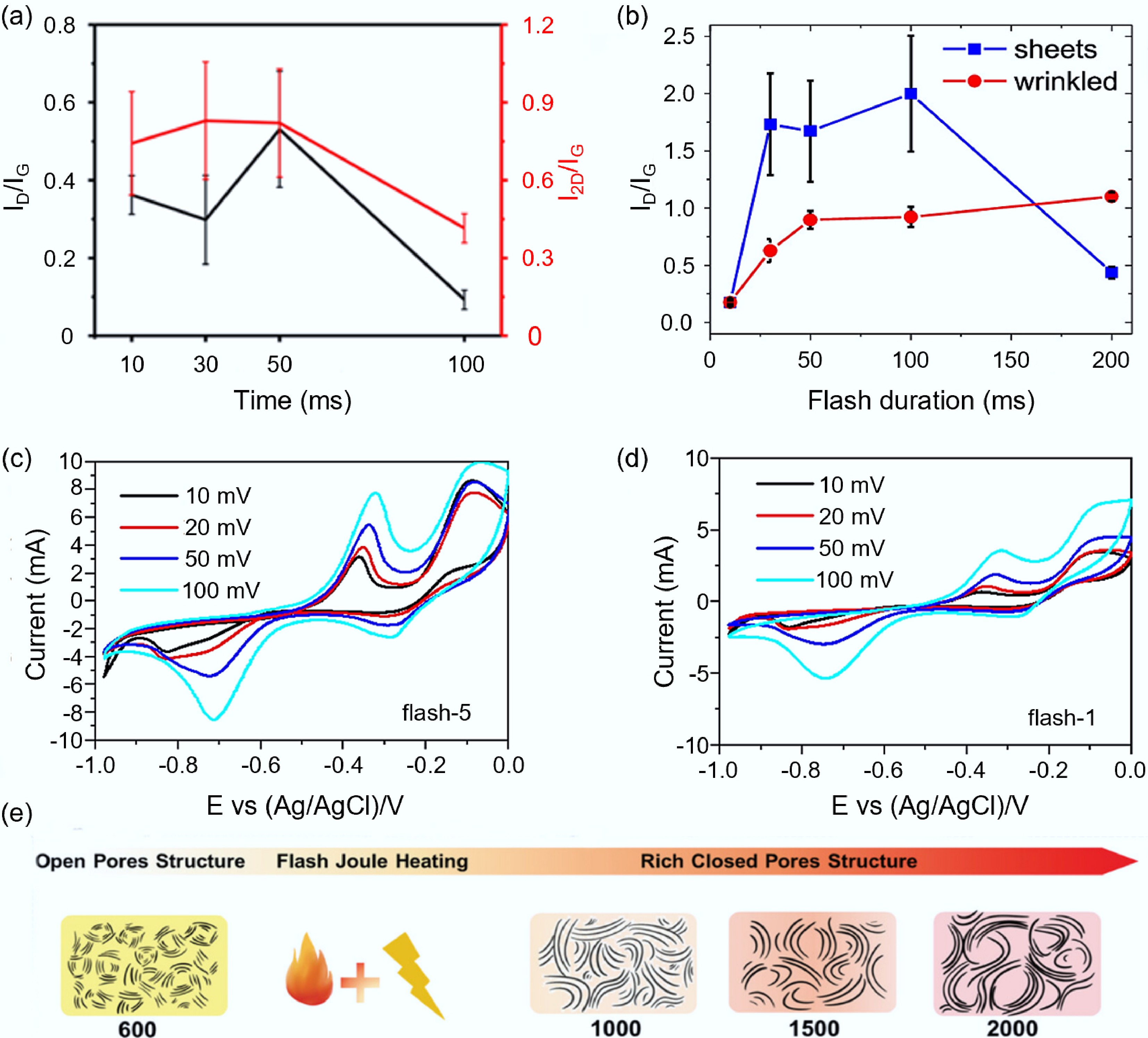 Effects of temporal parameters and temperature on the synthesis of carbon-based electrode materials by FJH. (a) Influence of flash time on the structure of graphite products[72]. (b) Influence of flash time on the structural properties of tFG sheets and wrinkled graphene[81]. (c) CV curve of the carbon product after flash for only once[82]. (d) CV curve of the carbon product after flash for five times[82]. (e) The regulatory mechanism of FJH temperature on HC pores[85].