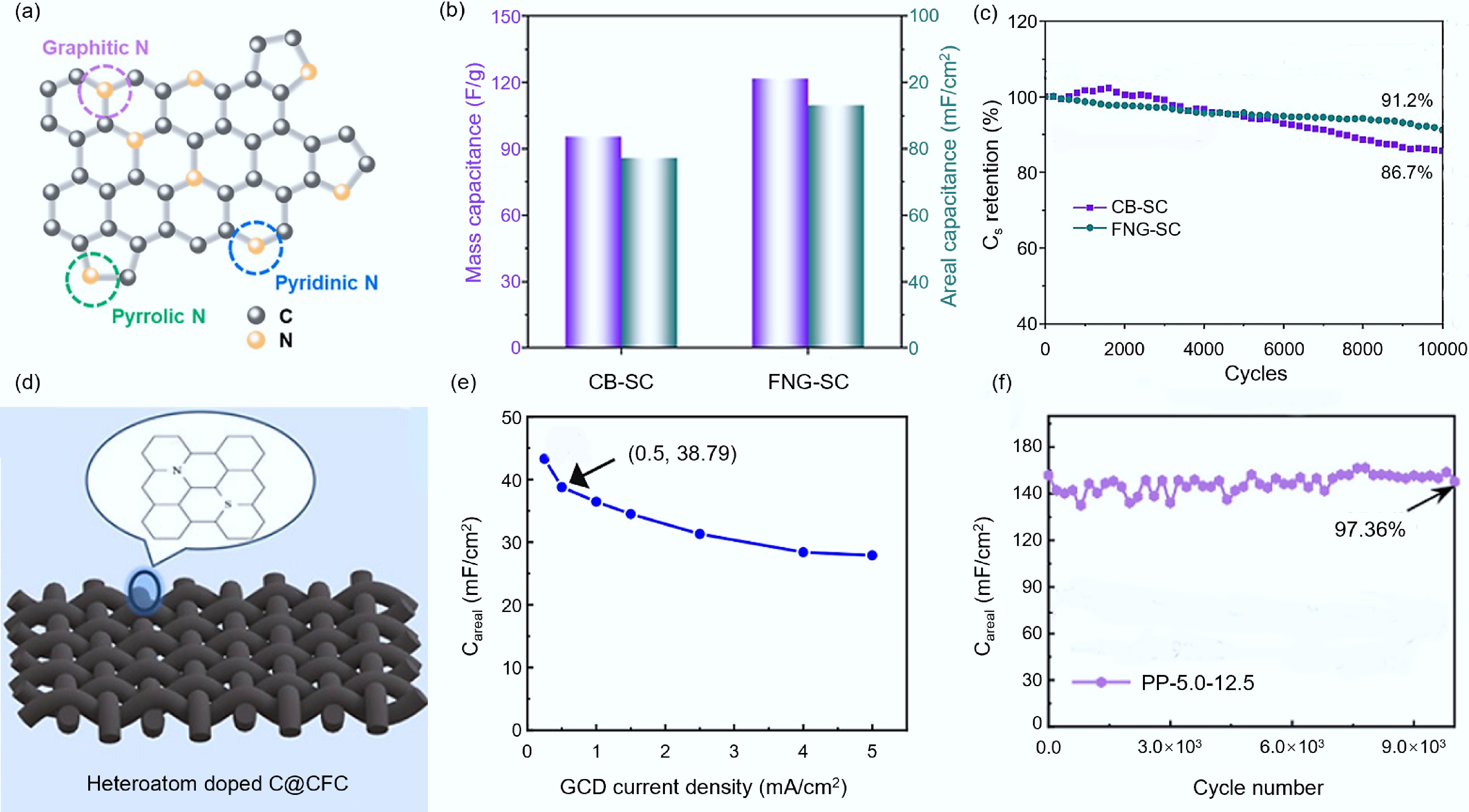 Doping heteroatoms to enhance the quality of carbon materials. (a) Schematic diagram of nitrogen-doped carbon structure[93]. (b) Comparison of specific capacitance of symmetrical quasi-solid-state supercapacitors assembled by FNG and CB[93]. (c) Comparison of capacity retention rates of symmetrical quasi-solid-state supercapacitors assembled by FNG and CB[93]. (d) Simplified diagram of N-S co-doped carbon structure[101]. (e) Surface capacitance of the supercapacitor assembled with PP-5.0–12.5[101]. (f) Capacity retention rate of supercapacitors assembled with PP-5.0–12.5[101].