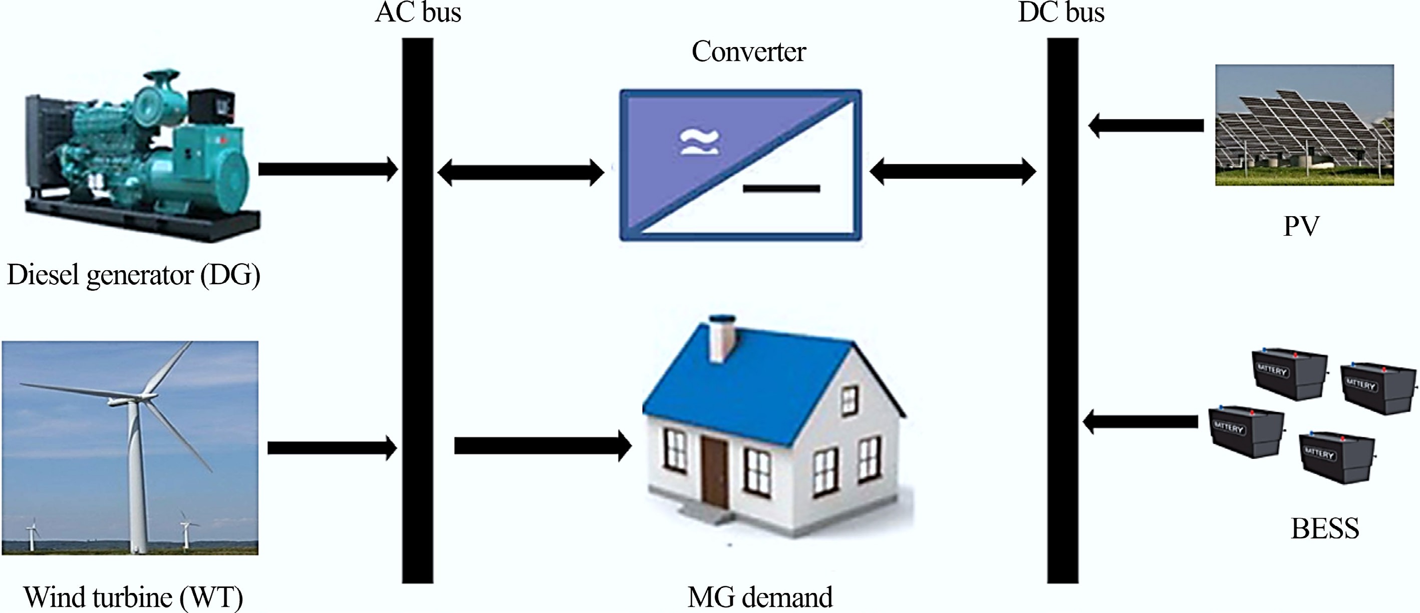 This section deals with the mathematical representation of each component constituting the hybrid system. The schematic diagram of the hybrid residential microgrid (MG) under consideration is shown in Fig. 1.