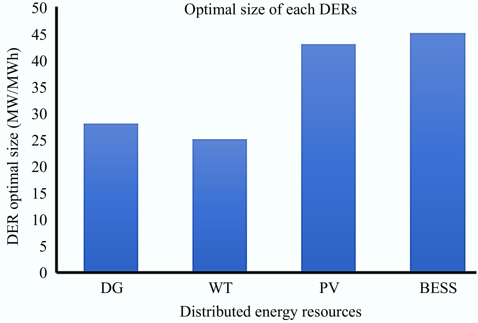 (US${\boldsymbol\$} $/kWh)NPC (US${\boldsymbol\$} $) DG 9.2 24.6 1.92 123,048,558.97 DG/WT 6.7 17.9 1.08 98,042,498.96 DG/PV 8.8 22.1 1.74 116,729,972.92 WT/BESS 0 0 0.99 110,167,373.27 PV/BESS 0 0 1.09 104,354,936,54 PV/WT/DG/BESS 2.1 8.4 0.73 85,542,372.16 From Table 4, Scenario 1 (where only the DG is used to meet the MG's demand) has the highest NPC, highest quantity of fuel consumed, highest COE, and highest environmental emissions, which is a result of the high quantity of diesel fuel consumed by the DG. Although this configuration is technically feasible, simple, and dispatchable, it is inefficient due to its negative impact on the system economics in terms of NPC, COE, fuel cost, and the environmental pollution associated with it. For Scenario 2 (where DG and WT are used to satisfy the MG), there is a significant reduction in DG runtime, and the quantity of diesel fuel consumed. However, it is characterized by excessive energy wastage due to the non-availability of an energy storage device to store the excess energy generated by the WT during periods of high wind profile. More so, the configuration is also associated with high NPC, COE, and CO2 emissions (though somewhat lower than that of Scenario 1), making it inefficient. Scenario 3 (which combines both DG and PV), has the second highest NPC, COE, quantity of diesel fuel consumed, greenhouse gas emissions, and lacks an energy storage system, which limits its economic performance, making it inefficient. In Scenario 4, WT and BESS are used to meet the demand of the MG. This configuration is advantageous due to the fact that the excess energy generated by the WT during periods of high winds is stored in the BESS which can later be dispatched during calm wind periods, or when the MG's demand exceeds the energy generated by the wind turbine; thus, greatly managing the WT's variability. However, the NPC and COE for this configuration are somewhat high compared to those of Scenarios 2, 5, and 6. Scenario 5 combines both PV and BESS to meet the demand of the MG. Although this configuration is characterized by zero emissions, zero diesel fuel consumption, and low maintenance costs, a large-sized BESS is required to account for the PV's high intermittency, leading to high NPC and COE, thus making the configuration ineffective and inefficient for the hybrid system. Scenario 6, which integrates all four DER components, is considered the optimal DER configuration. In this configuration, the BESS is used to store the excess energy generated by the renewable energy sources during their peak periods and to manage the high variability associated with them, while the DG serves as a backup, generating only when there is a power deficit in the system. This configuration achieved the lowest NPC, COE, quantity of diesel fuel consumption, and greenhouse gas emissions, as shown in Table 4. It combines the reliability of the DG with the cost-effectiveness and environmental benefits of solar and wind, while BESS enables load balancing and further minimizes diesel dependency. The configuration provides the best synergy between renewable energy resources and dispatchable backup, ensuring power availability at all times. Figure 10 shows the optimized size of each DER for the optimal system configuration.