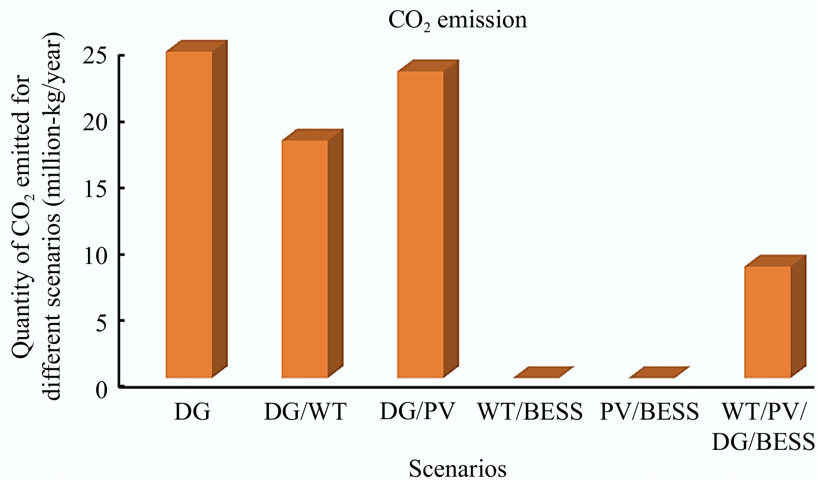 Since the renewable energy resources (WT and PV) suffer high variability, and since the microgrid's demand is fluctuating in nature, the performance of the microgrid is greatly affected by these resources. In this section, the effect of the BESS on the MG performance in terms of quantity of diesel fuel consumed, COE, and quantity of CO2 emitted is analyzed. The quantity of CO2 emitted by each scenario is depicted in Fig. 11.