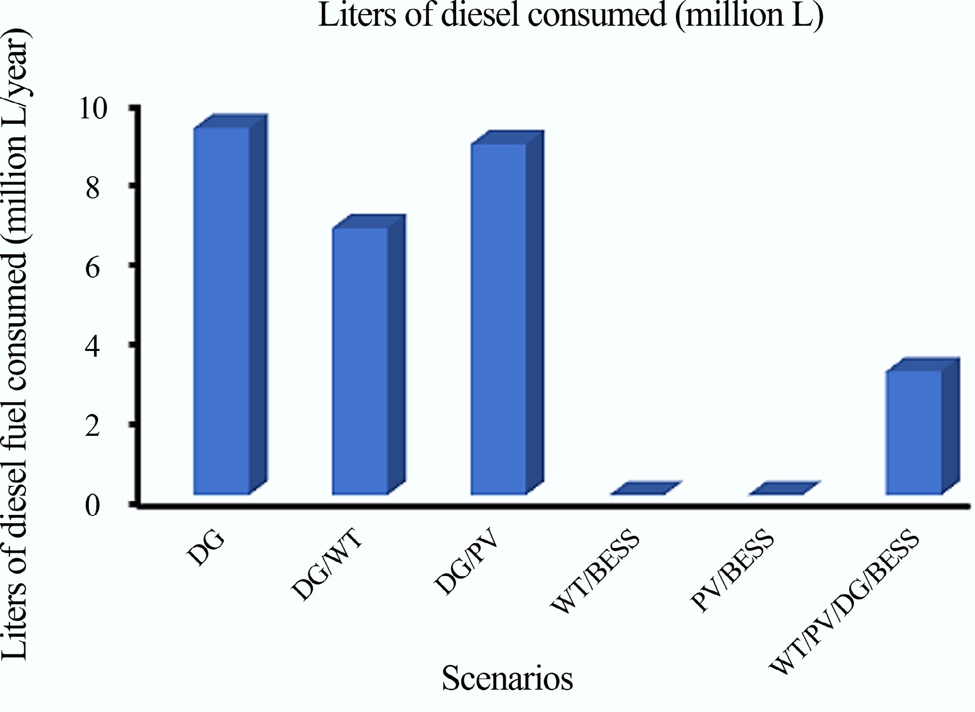 Furthermore, the effect of the BESS on the MG can be viewed in terms of the quantity of fuel consumed. Figure 12 depicts the quantity of diesel fuel usage in the MG for the six different DER configurations. From Fig. 12, it can be concluded that in Scenarios 4 and 5, the quantity of diesel fuel consumed is zero and in Scenario 6, there is a 74.44% reduction in diesel fuel consumed compared to Scenario 1.