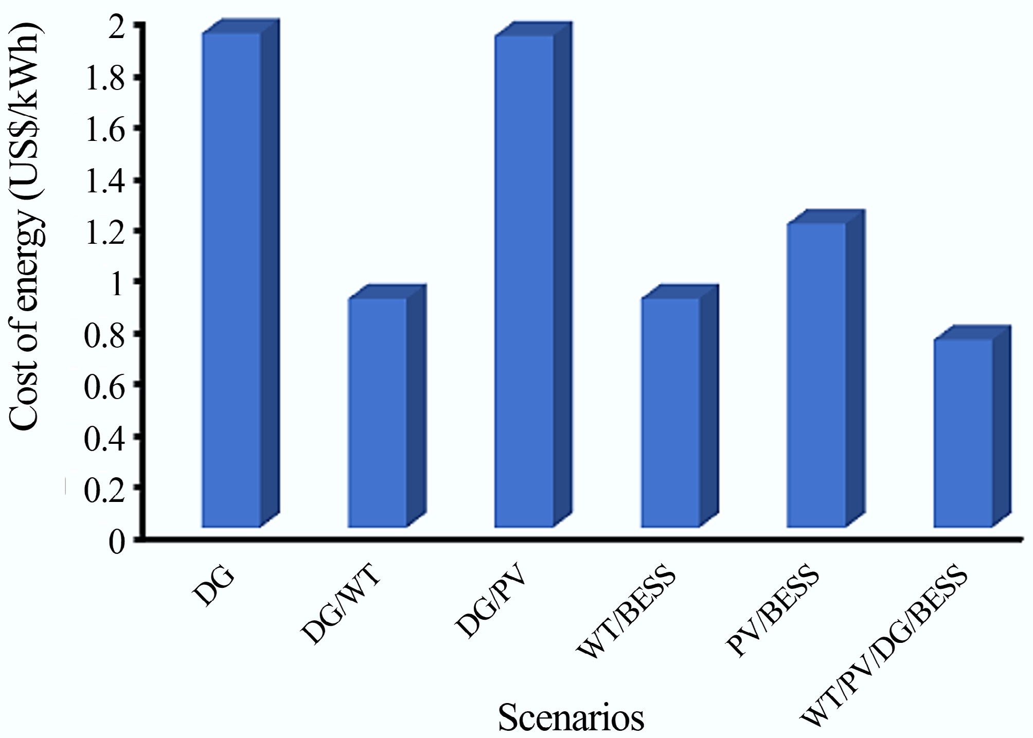 The cost of energy for the different scenarios is also given in Fig. 13. From Fig. 13, it can be seen that there is a significant reduction in the cost of energy for the scenarios where the BESS is implemented except for the DG/WT configuration. In the optimum configuration, it is evident that there is an approximately 46.34% reduction in the cost of energy compared to Scenario 1.
