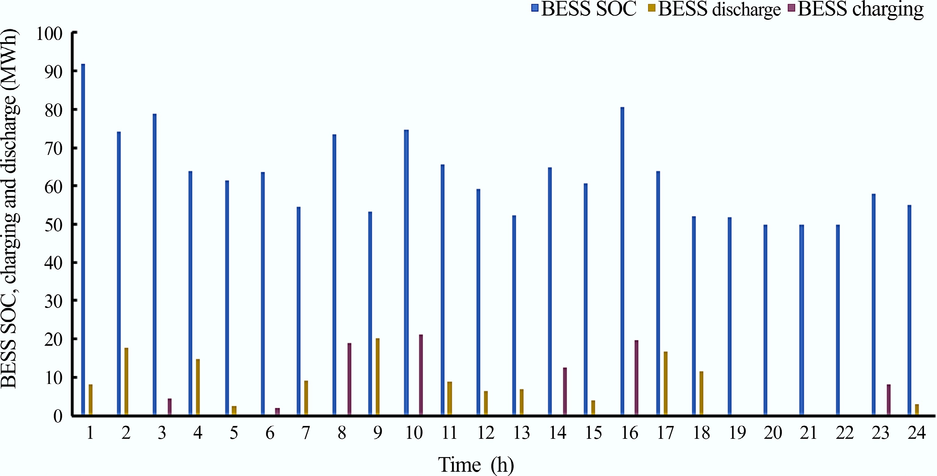 From Fig. 7, it can be seen that during hours 3, 8, 10, 14, and 16, excess energy is generated by the renewable energy sources, i.e., the energy generated exceeds the hourly demand on the microgrid. This excess energy is stored in the BESS. During hours 1, 2, 4–7, 9, 11–13, 15, and 17–24, the microgrid's demand exceeds the total energy generation of the renewable energy sources. This power deficit is met using either the energy stored in the BESS, the DG, or a combination of both.