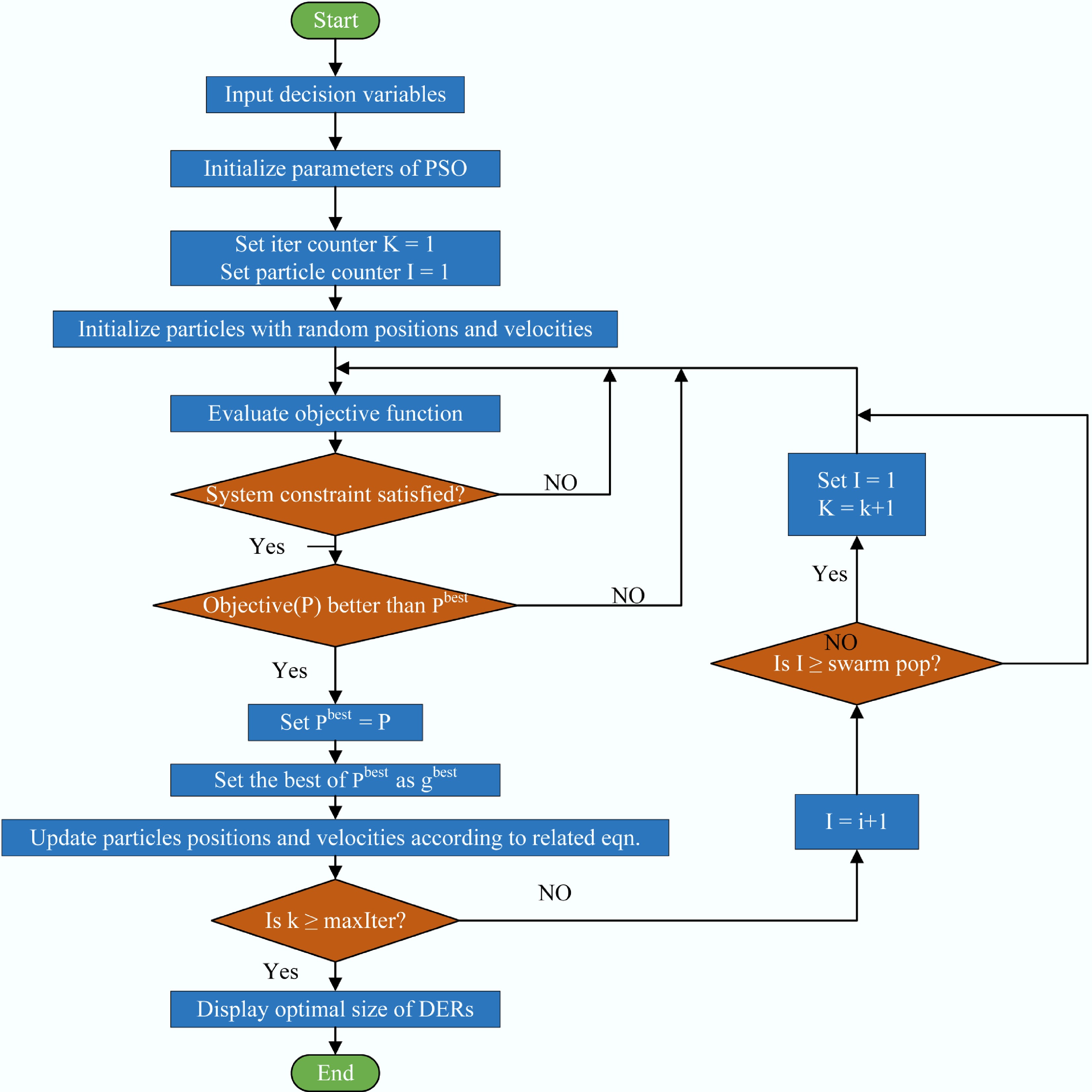 The Particle Swarm Optimization (PSO) algorithm is employed to find the optimal configuration of the DERs that minimizes the objective function. The choice of PSO for this study is due to its effectiveness in handling complex, non-linear, and multi-modal optimization problems common in hybrid microgrids.
