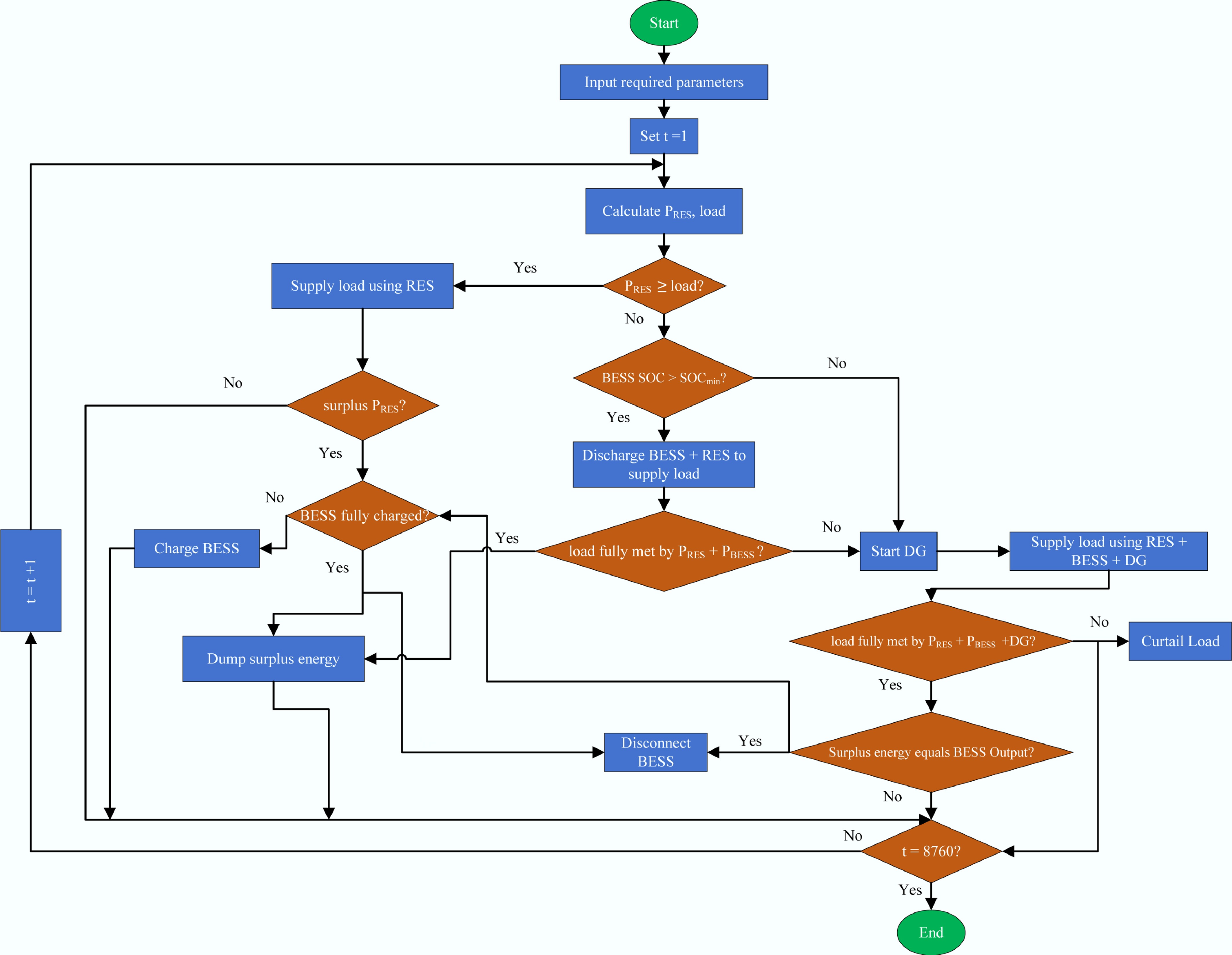 To ensure an efficient and effective supply of energy, it is necessary to manage the energy distribution within the residential microgrid. Figure 3 gives the flow chart of the EMS employed in this study to manage the energy generation and distribution within the hybrid residential microgrid. In this strategy, priority is given to the renewable energy resources, where the microgrid demand is first met using energy generated from the renewable resources. The operational strategies adopted for this study are implemented by the following rules: