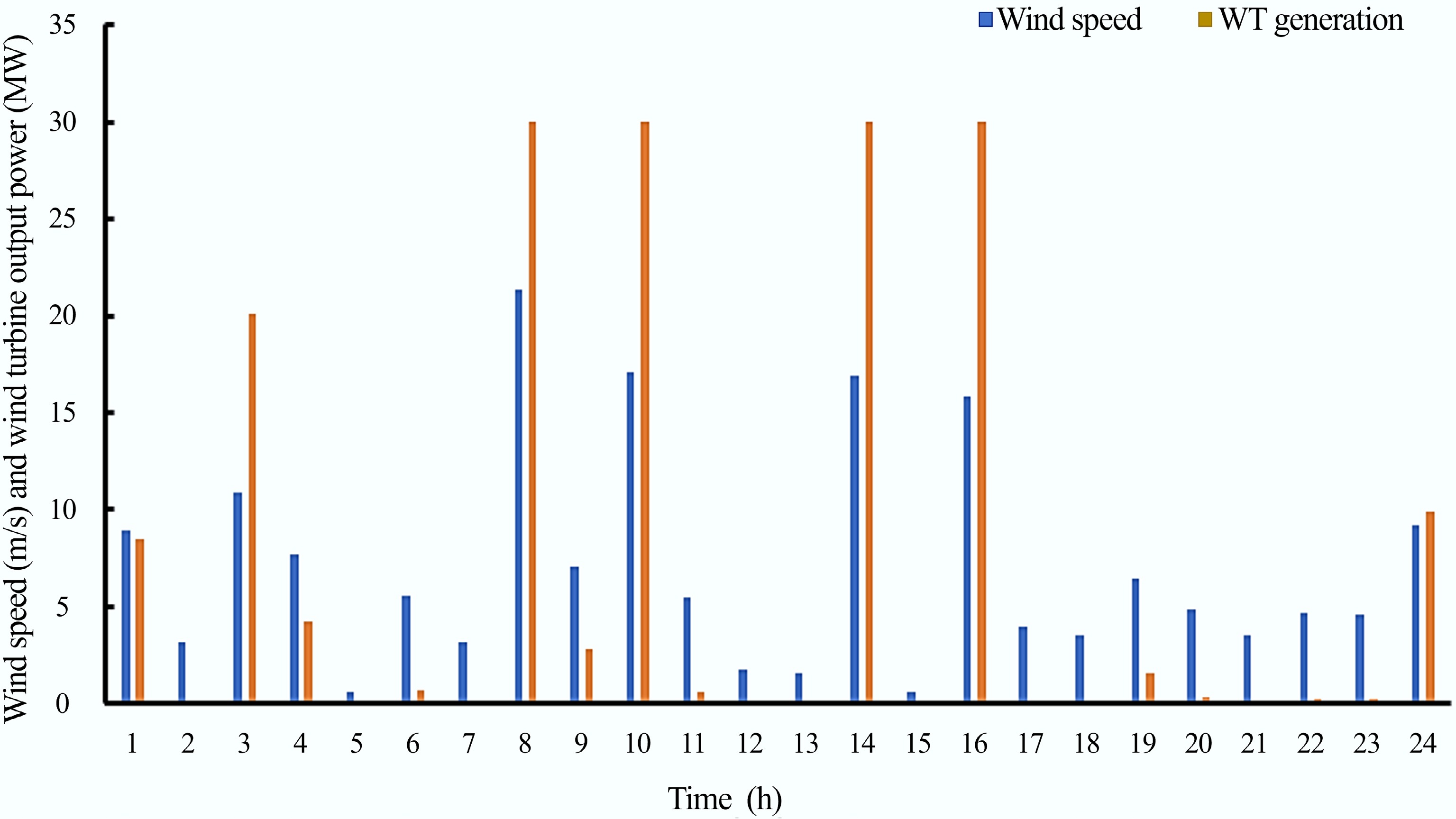 The energy generated by the WT and the wind profile for a 24-h period are depicted in Fig. 6. At low wind speeds, the energy production is minimal, while at moderate and stable wind speeds, the WT operates efficiently. However, during very high wind speeds, protection mechanisms operate to stop generation in order to protect the WT from damage.