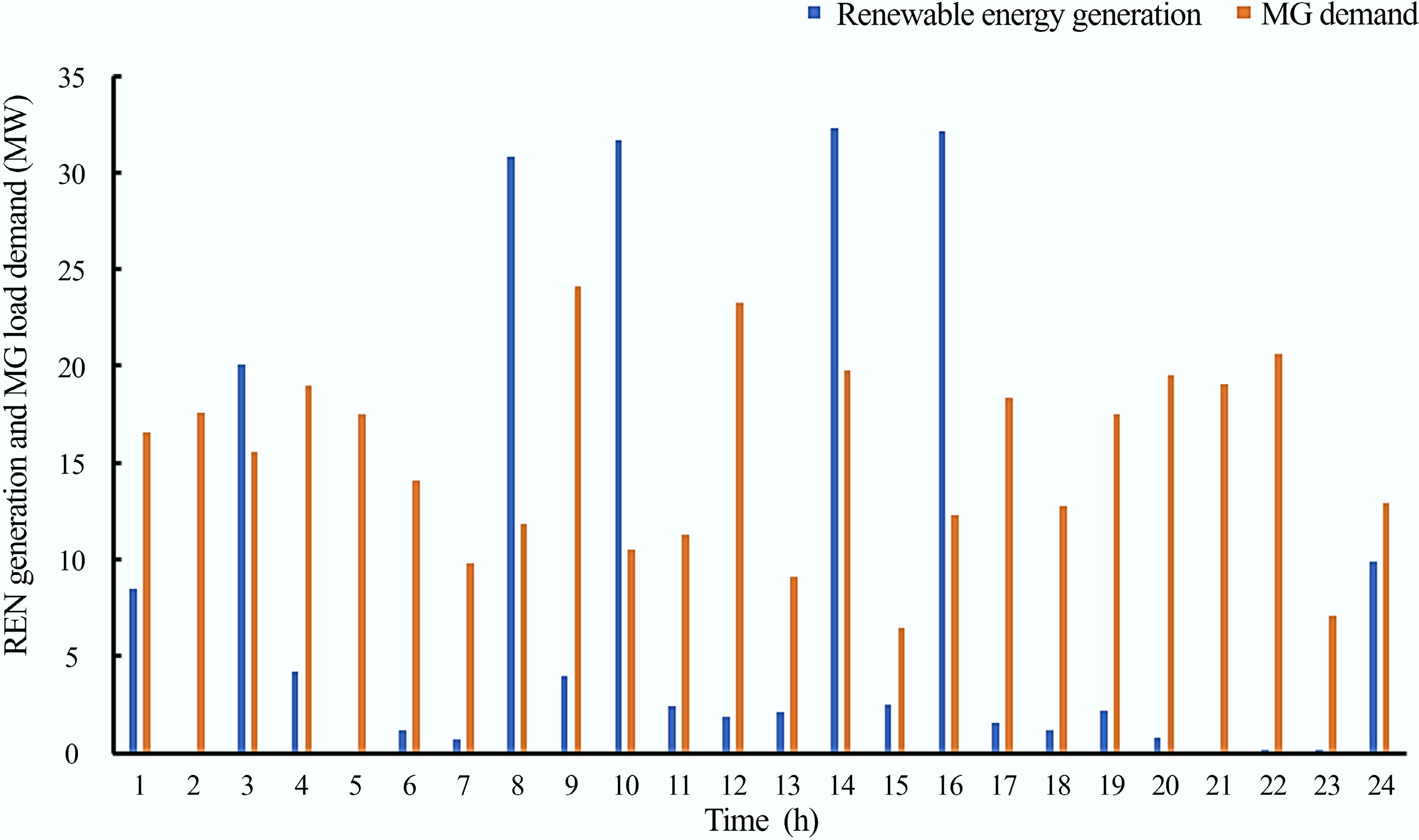 $ {E}_{bat\left(t\right)}={E}_{bat\left(t-1\right)}+\left[{E}_{RES(t)}-\dfrac{{E}_{L(t)}}{{\eta}_{converter}}\right]\times {\eta}_{charge} $ (5) where, Ebat(t) and Ebat(t−1) denote the stored energy in the battery at time t and time (t – 1), ERES(t) denotes the total energy generated by the RER at time t, EL(t) represents the energy demand of the MG at time t, ηconverter denotes the converter efficiency, and ηcharge denotes the battery efficiency during the battery charging and discharging process.