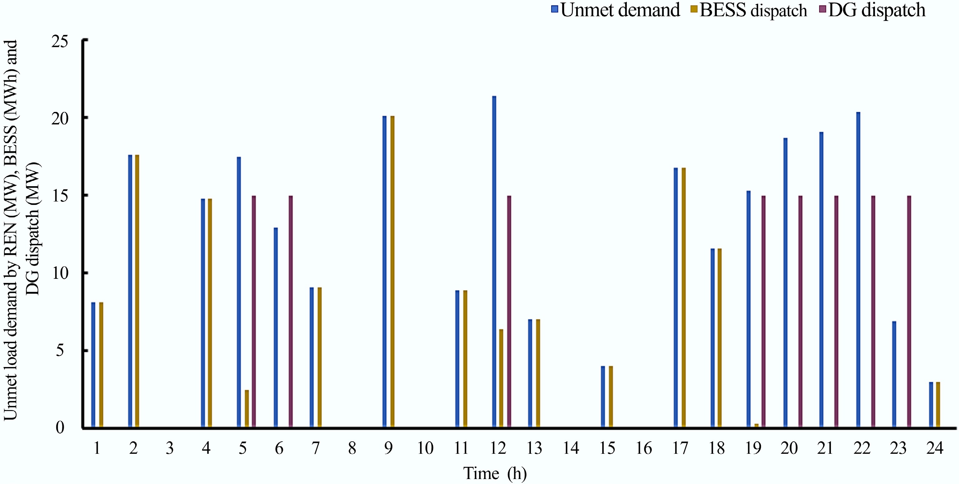 In situations where the combined generation of the renewable sources and the BESS is insufficient to meet the load demand, the DG is dispatched to supply the remaining unmet load, while the renewable sources and the BESS continue to operating within their respective limits as seen in Fig. 9.