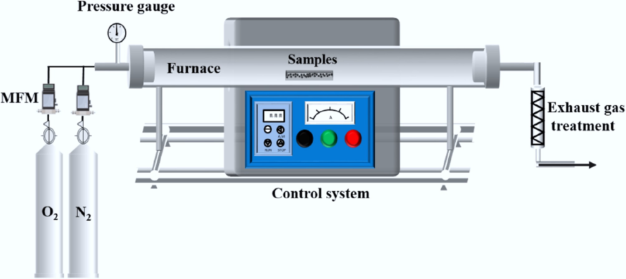 • The isothermal combustion experiments of CG and SS were carried out in a sliding tube furnace reaction system, as shown in Fig. 1. The experimental system consists of a gas distribution system, a combustion reaction system, and an exhaust gas treatment system. The gas distribution system was composed of O2 and N2, and the gas flow rate was controlled at 1 L/min. For each experiment, an accurately weighed 0.5 g of sample was evenly spread in a quartz boat, which was placed in the to-be-heated area of the furnace tube. When the furnace chamber reached the set temperature, the furnace body was quickly slid to the location of the sample to initiate the combustion reaction. After the reaction, the furnace body was moved to the other side, and the quartz boat was cooled and removed for weighing. Samples were taken and weighed at different combustion time intervals before the sample mass became constant. To ensure the accuracy of the experimental results, at least two repeated experiments were carried out under each specific working condition.