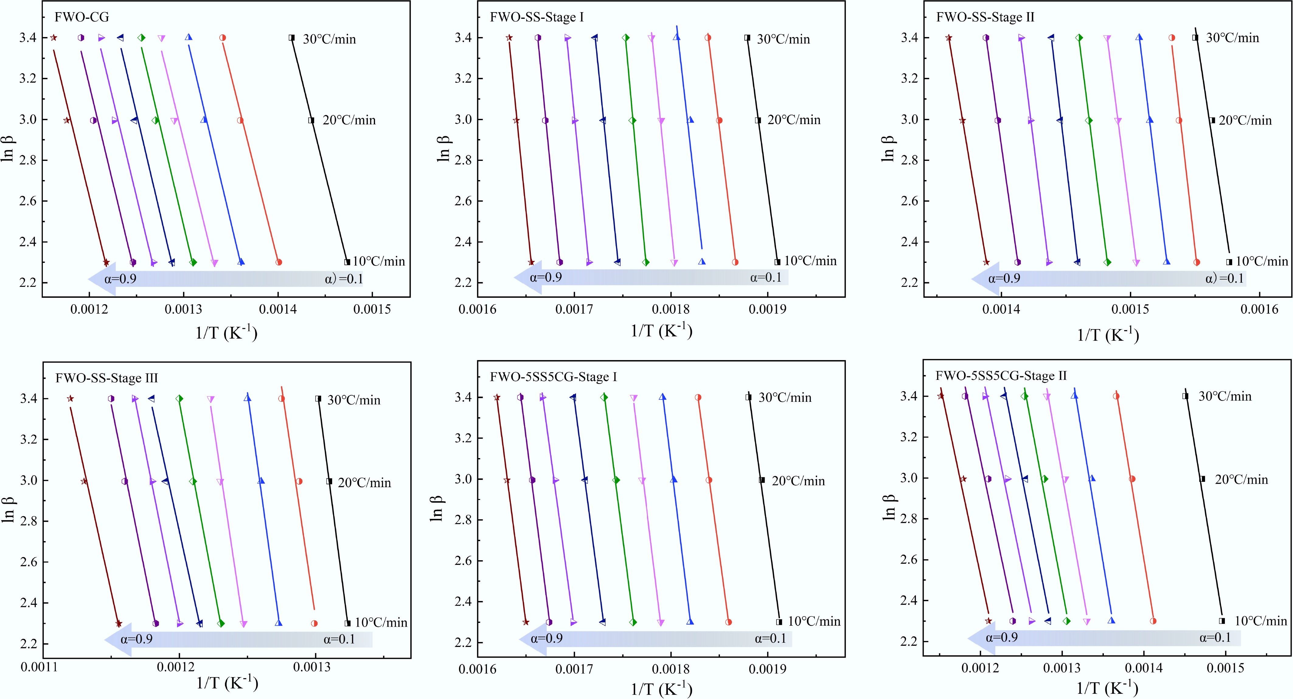 where, A is the pre-exponential factor (s−1); Ea is the apparent activation energy (kJ/mol); R is the gas constant (8.314 J/[mol·K]).