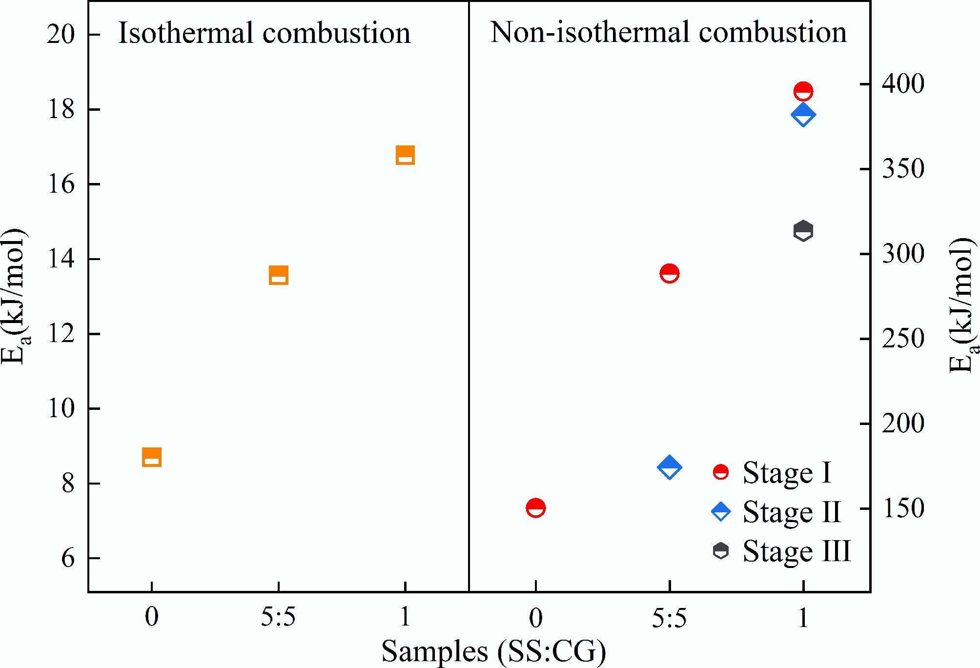 The reaction activation energy of CG and SS in different heating processes.