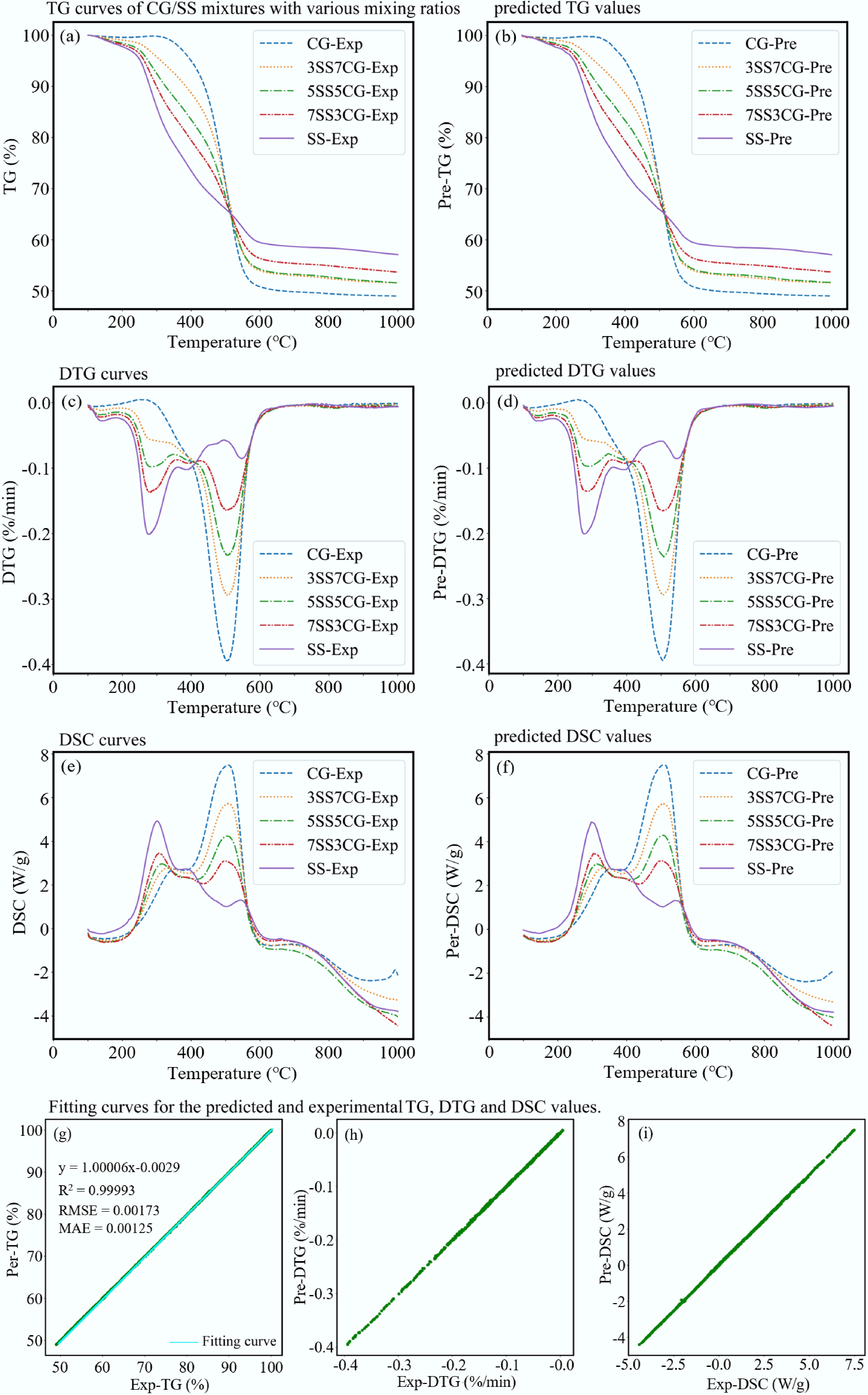 Prediction of co-combustion under non-isothermal conditions. (a) TG curves of CG/SS mixtures with various mixing ratios. (b) Predicted TG values. (c) DTG curves. (d) Predicted DTG values. (e) DSC curves. (f) Predicted DSC values. (g)−(i) Fitting curves for the predicted and experimental TG, DTG, and DSC values.