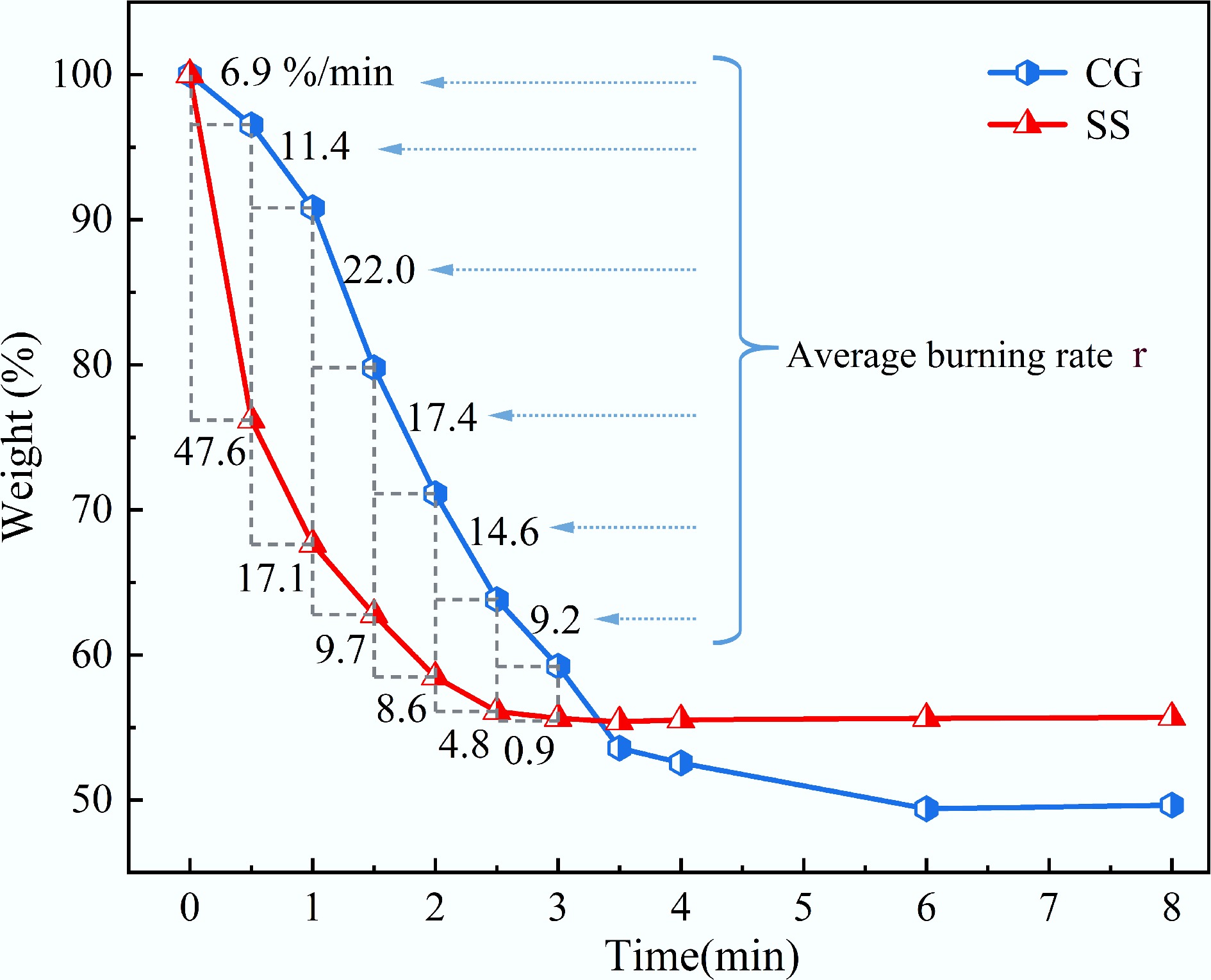 where, ri~j is the average burning rate in i~j min (%/min); TGi and TGj are the weight loss of the sample at i and j min, respectively (%).