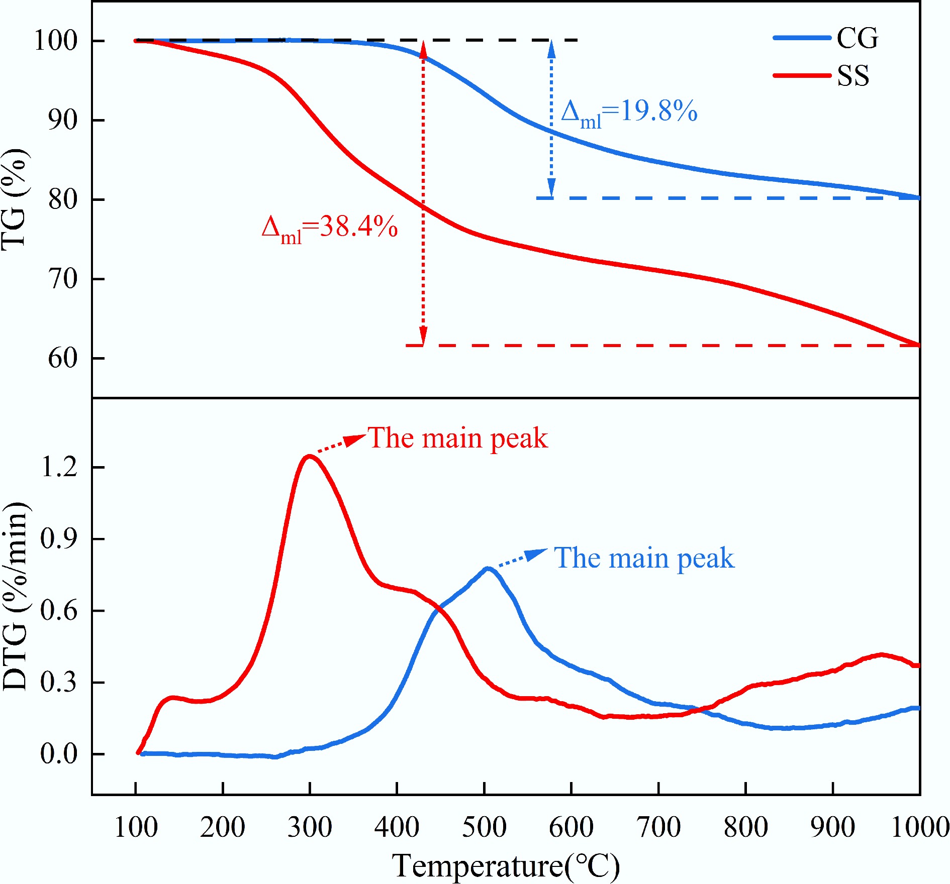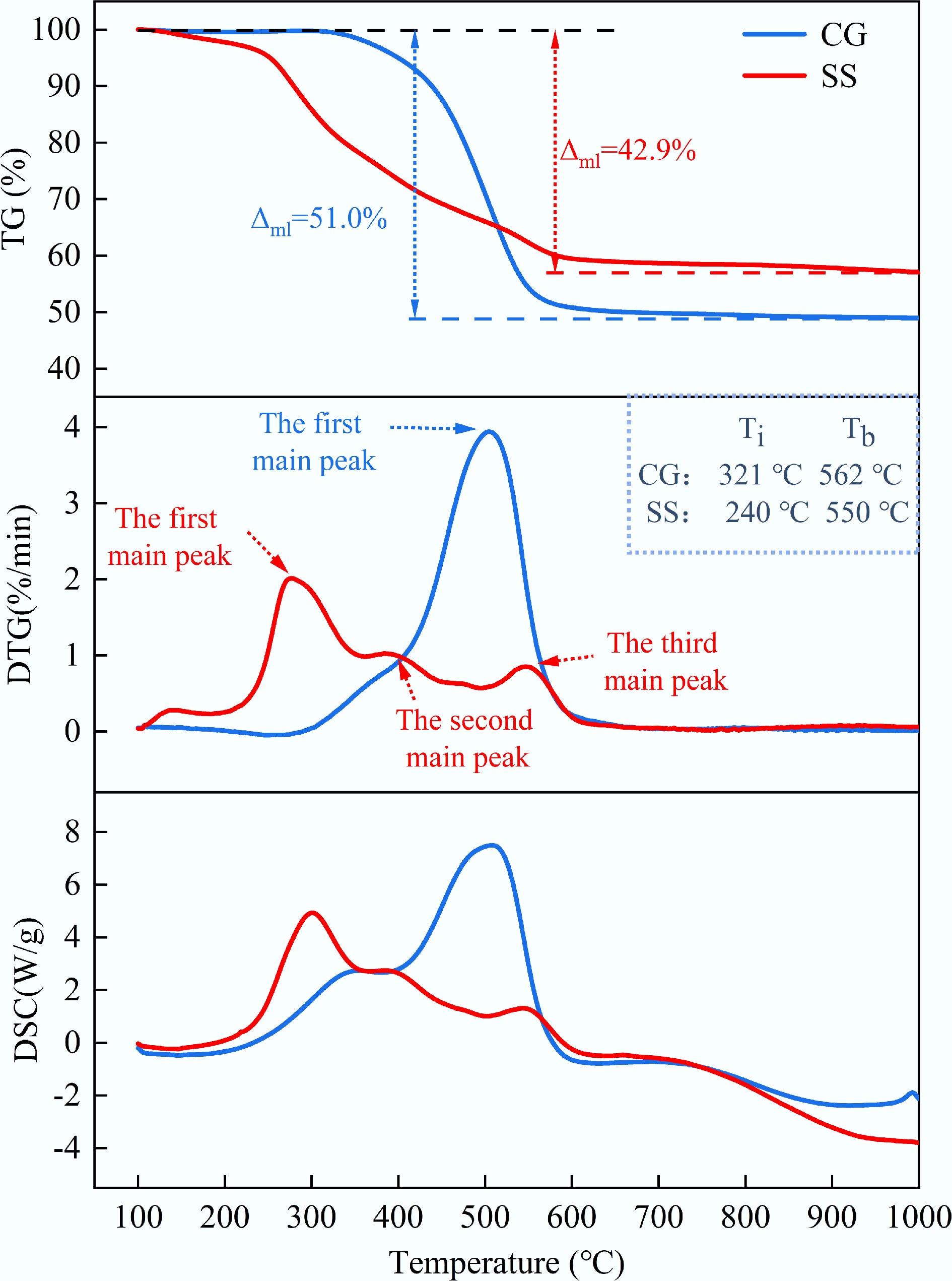 where, TGC (DTGC) represents the theoretical TG (DTG) values of the mixture (% and %/min, respectively); µCG and µSS denote the mass fractions of CG and SS in the mixture (%); TGCG (DTGCG) and TGSS (DTGSS) are the experimental TG (DTG) values of CG and SS, respectively (% and %/min).