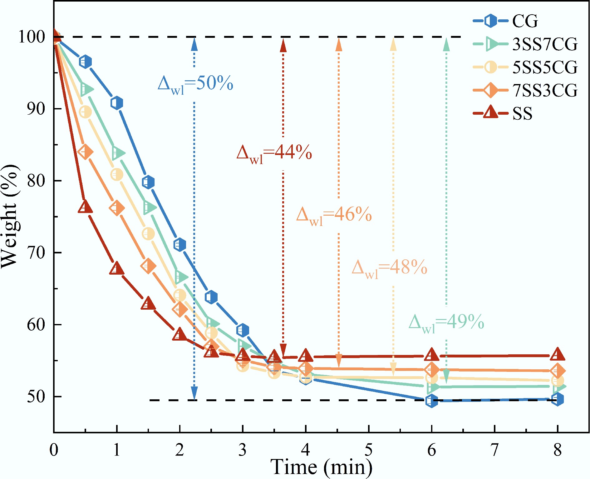 $ {\text{TG}}_{\text{i}}=\dfrac{{\text{w}}_{\text{i}}-{\text{w}}_{\text{1}}}{{\text{w}}_{\text{0}}}\text{×100} $ (3)