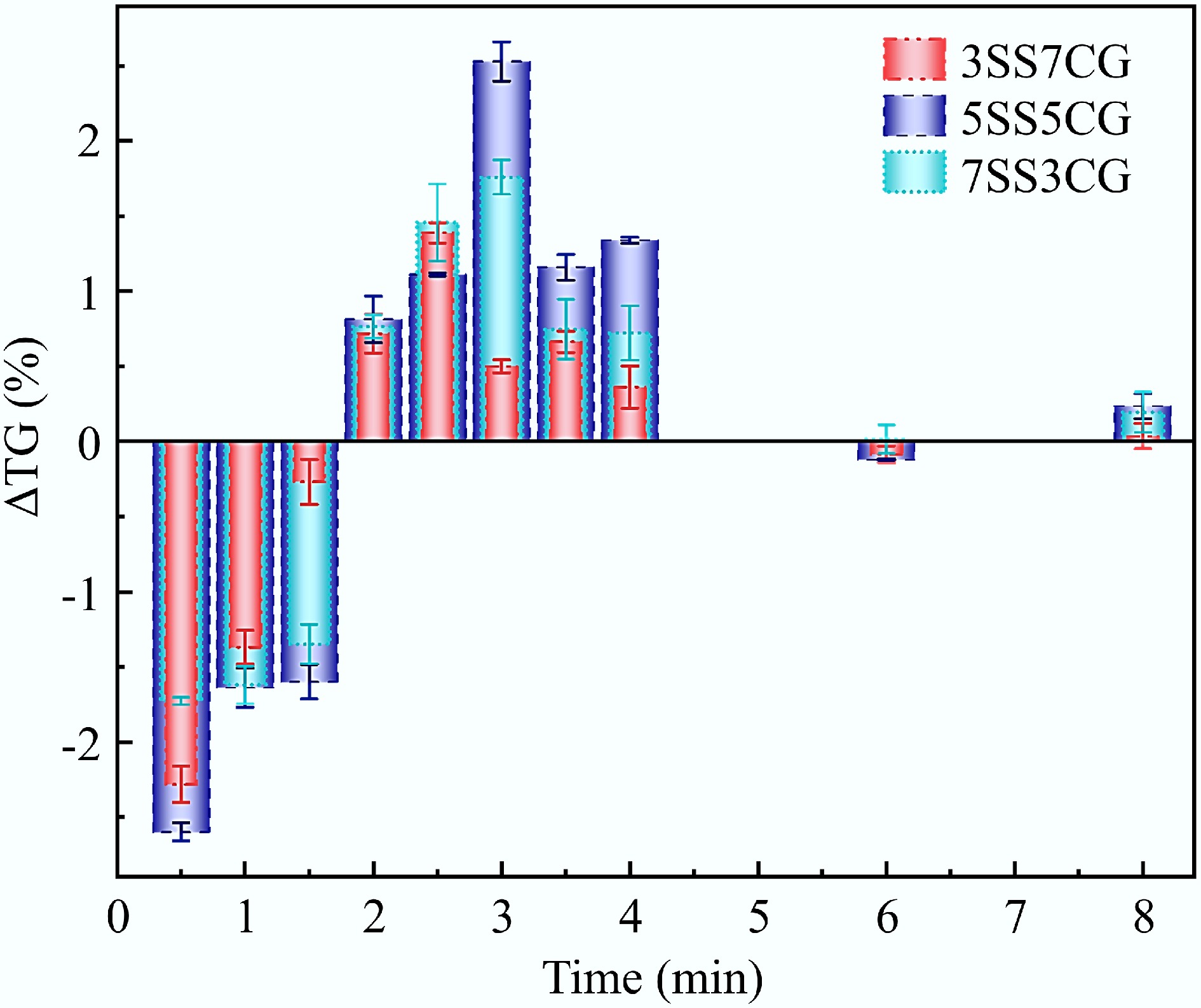 To comprehend their co-combustion behavior, blends of CG and SS on a weight basis were prepared. The mass fractions of SS in the samples varied from 0%, 30%, 50%, 70%, and 100%, and are denoted subsequently as CG, 3SS7CG, 5SS5CG, 7SS3CG, and SS for simplicity.
