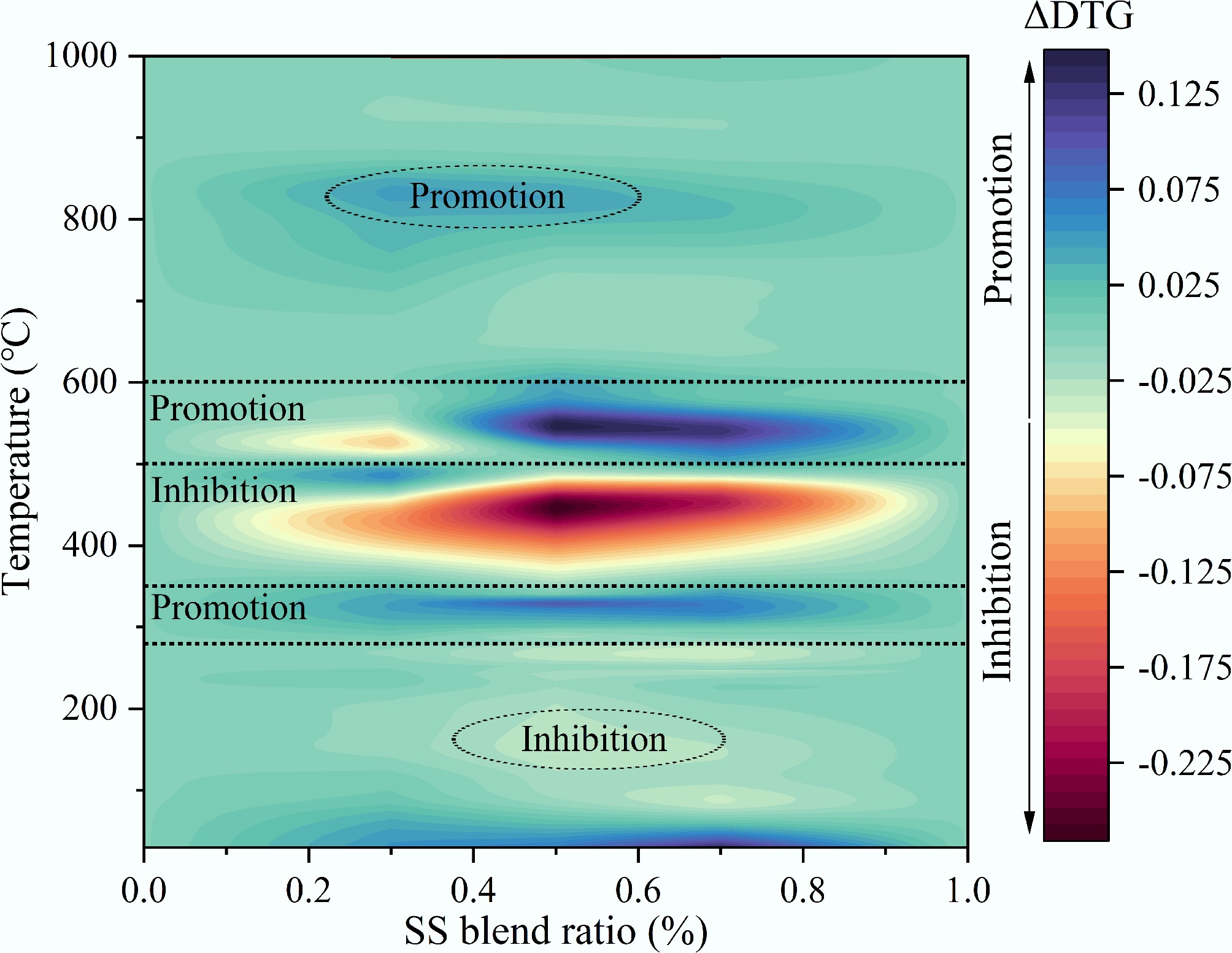 To evaluate the interactions between CG and SS, the theoretical TG and DTG values of the blends were compared. A greater deviation between the experimental and theoretical TG and DTG curves indicated a stronger interaction between CG and SS. The theoretical TG and DTG values for the co-combustion of CG and SS (TGC and DTGC) were calculated using Eqs (4) and (5), respectively: