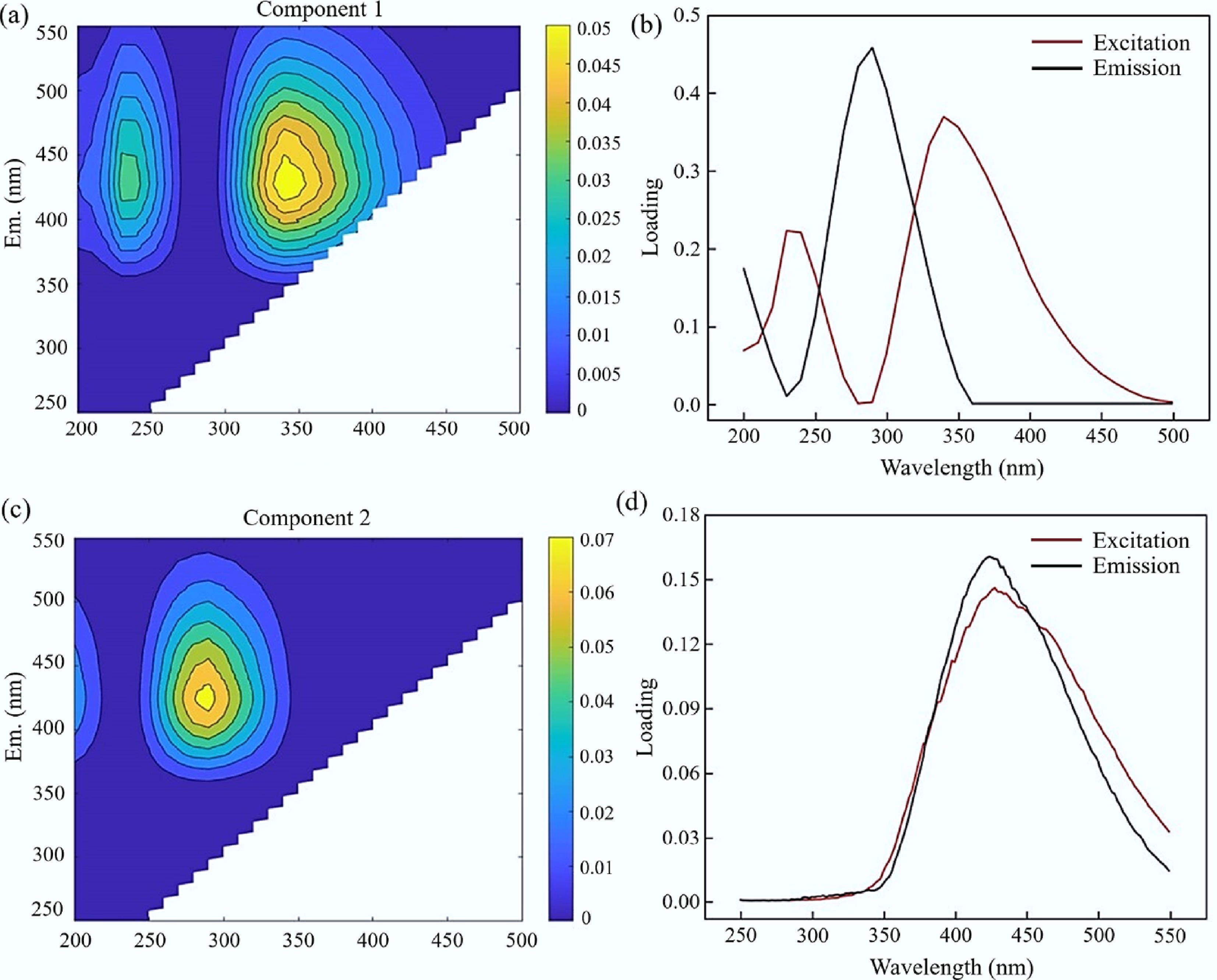 Two-component PARAFAC model generated from FW HLP. (a), (b) Contour plots of the spectral shapes. (c), (d) Excitation and emission load diagrams.