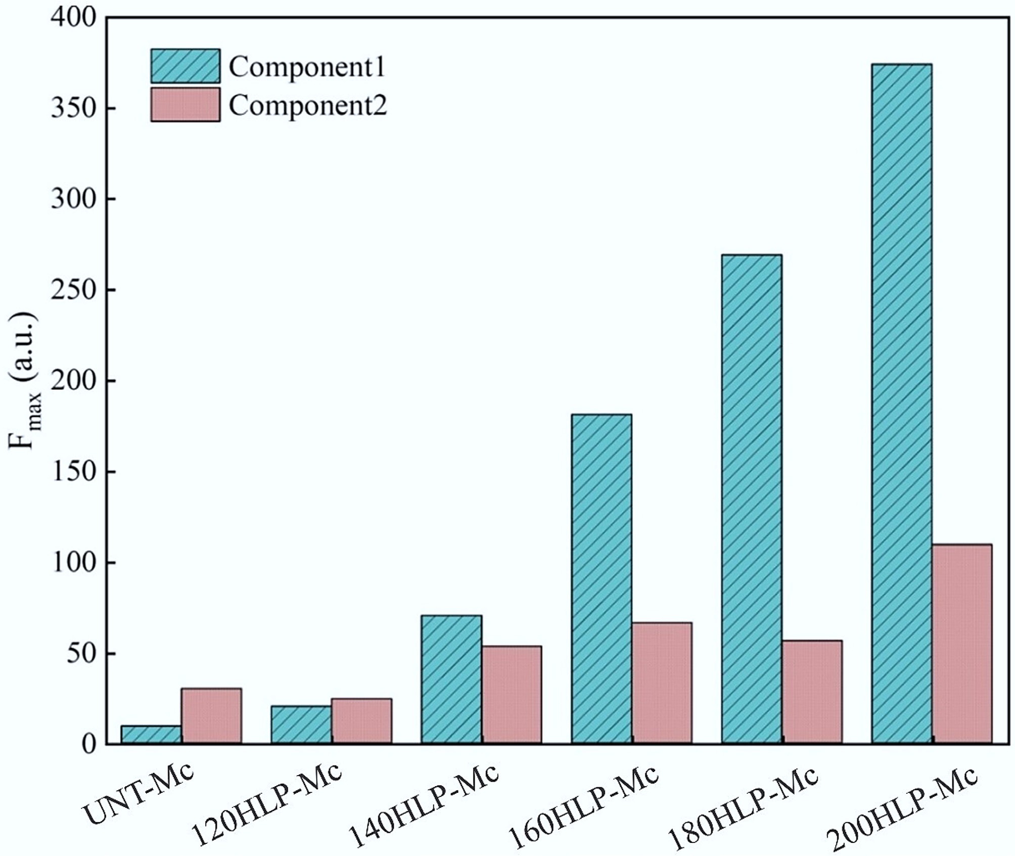 Based on this, the maximum fluorescence intensity index (Fmax) was chosen as a semi-quantitative measure to assess the melanoidins content in each group. Figure 4 shows each component's Fmax in the two-component model. Component 2 was not analyzed as a melanoidin in this study. The Fmax of Component 1 steadily increased as the hydrothermal temperature rose. At 200 °C, the Fmax reached 374.14 (a.u.), significantly higher than the 9.35 (a.u.) observed in the untreated group. This suggested that melanoidins were rapidly produced during the hydrothermal process. A similar conclusion was supported by the earlier methods: within a specific temperature range (120–200 °C), the melanoidin content consistently increased with temperature.