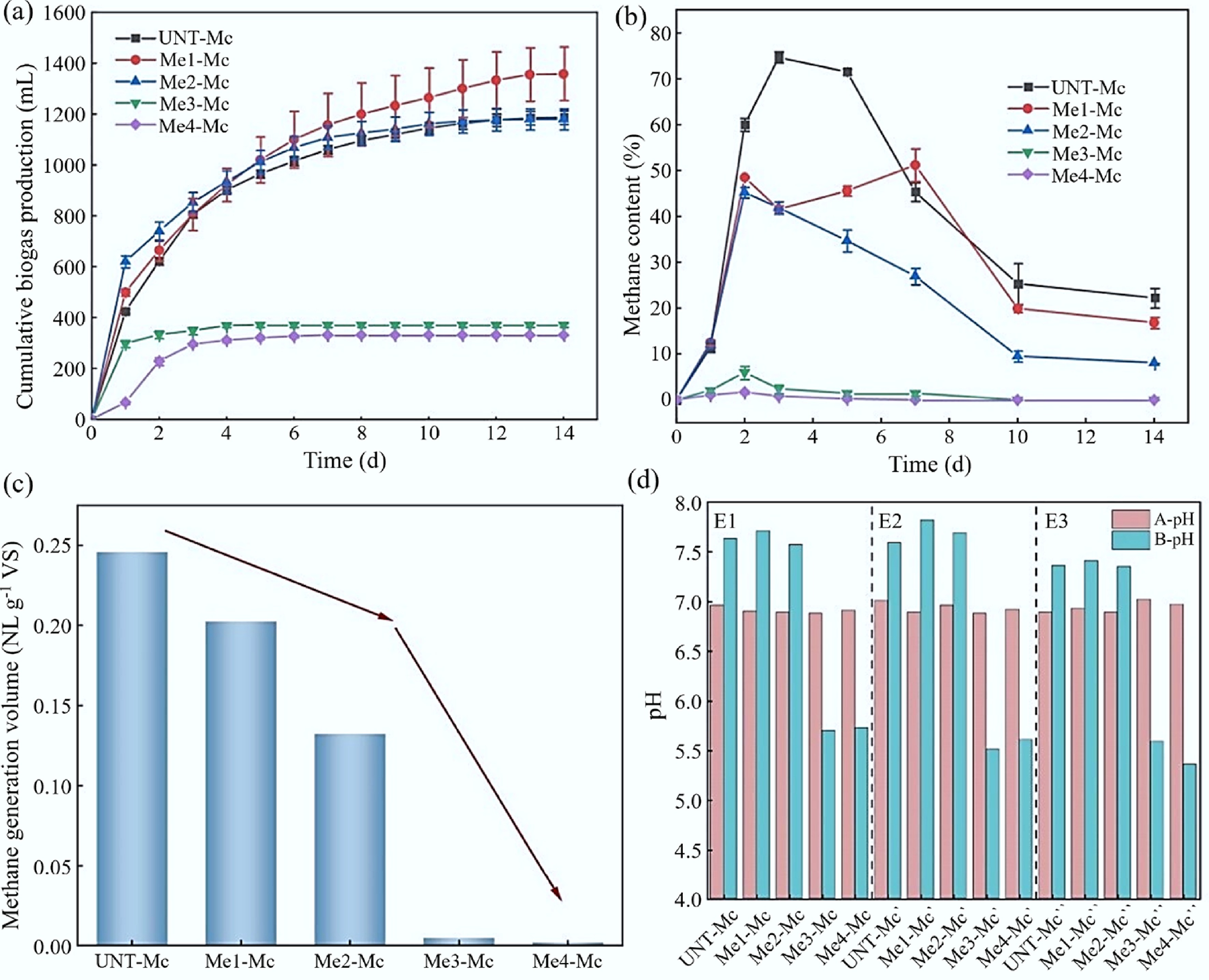 To investigate the effects of melanoidins on the AD of FW, this study added melanoidins at multiple levels relative to the FW volume (approximately 25 mL). The additions were 1× (25 mL, 2.08 mg·mL−1, SCOD), 2× (50 mL, 4.16 mg·mL−1), 3× (75 mL, 6.24 mg·mL−1), and 4× (100 mL, 8.32 mg·mL−1). Each sample was labeled following the format 'Melanoidins Addition Multiple-Component'. For example, 'Me3-Mc' and 'UNT-Mc' represented the experimental group with 75 mL of melanoidin solution added to the FW mixture, and the control group without melanoidins, respectively.