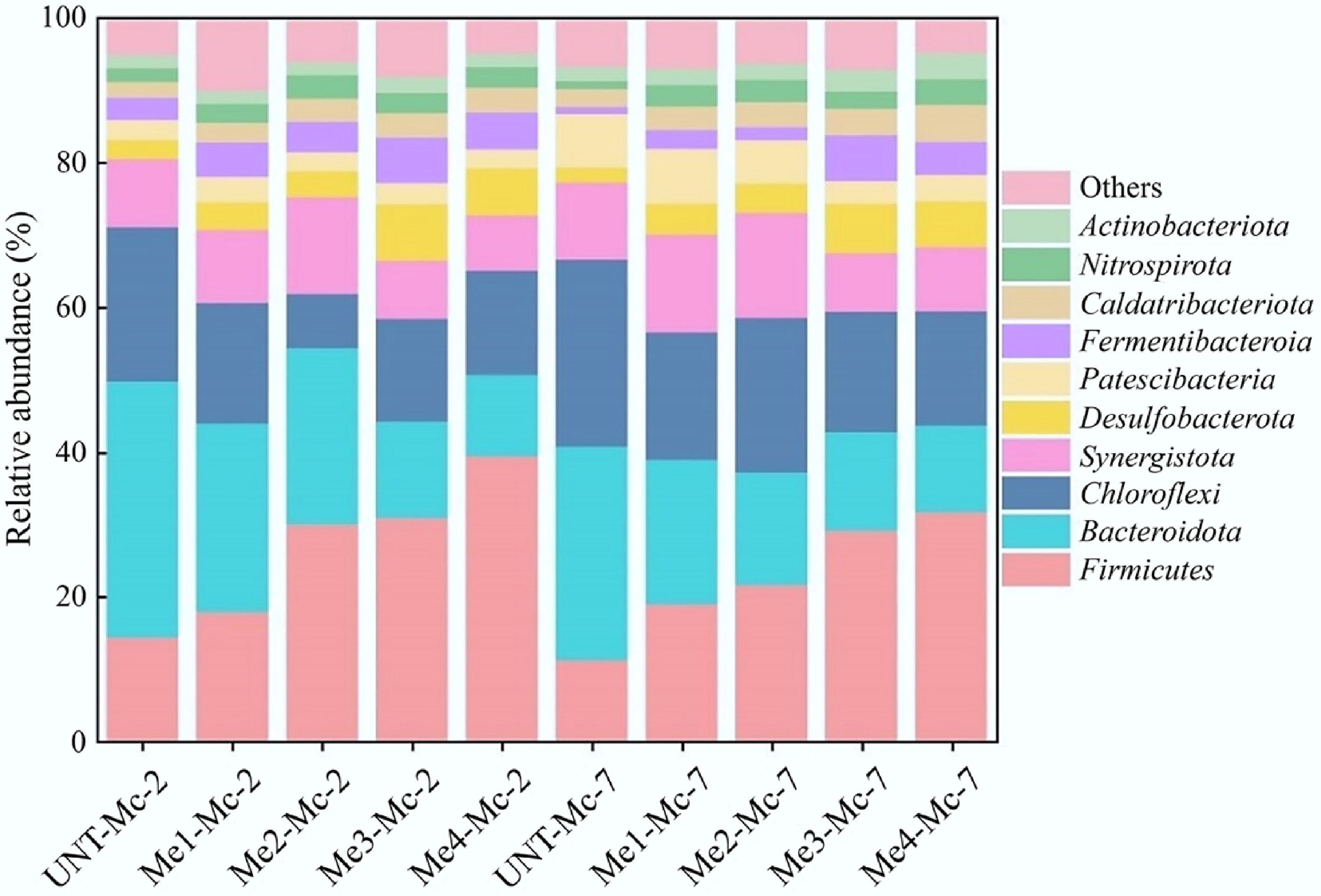 Beta diversity analysis was further conducted on the ten samples to assess bacterial community differences, as shown in Fig. 7b. The addition of melanoidins significantly influenced the bacterial community structure within the system. This effect was more pronounced in the high-dose melanoidin groups, particularly evident from the greater distance between sample points of the Me3-Mc-2 and Me4-Mc-2 groups and the UNT-Mc-2 control point. As fermentation progressed, the distance between sample points of the high-dose groups and the UNT-Mc-7 control point further increased, indicating significant divergence in microbial community structure over time.