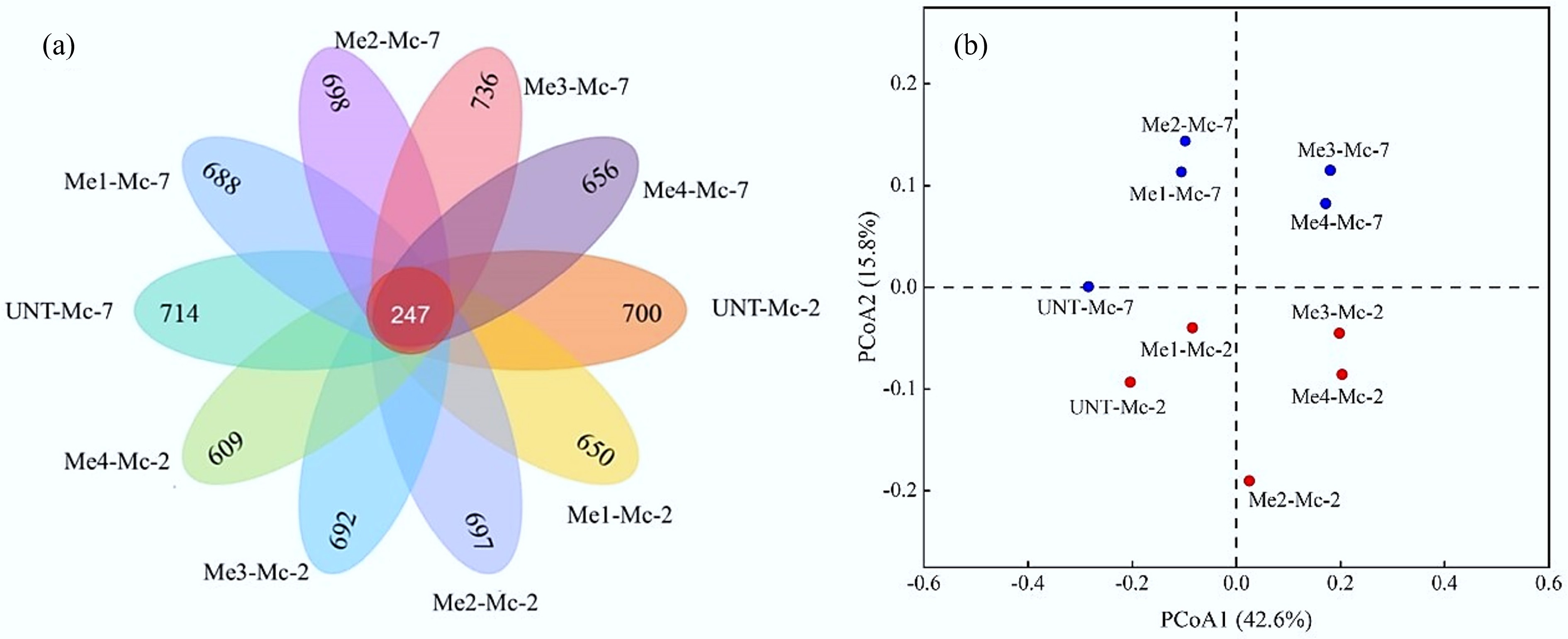 Sample Observed_species Chao1 Shannon UNT-Mc-2 1,357 1,369.44 7.42 Me1-Mc-2 1,332 1,371.99 7.31 Me2-Mc-2 1,367 1,385.99 7.15 Me3-Mc-2 1,369 1,402.32 7.11 Me4-Mc-2 1,227 1,242.25 7.11 UNT-Mc-7 1,402 1,448.60 7.23 Me1-Mc-7 1,435 1,475.43 7.54 Me2-Mc-7 1,389 1,407.86 7.53 Me3-Mc-7 1,392 1,414.44 7.45 Me4-Mc-7 1,280 1,290.23 7.42 Venn diagrams are commonly used to analyze species differences and visually identify shared and unique species among different samples. In this study, the numbers in the Venn diagram represented the count of ASVs, as shown in Fig. 7. Overall analysis revealed that the experimental groups with different melanoidin dosages and the untreated control group shared 247 ASVs. The proportion of unique ASVs in each sample was higher than that of the shared ASVs, indicating low similarity among the samples. The addition of melanoidins, along with the progression of fermentation time, altered the microbial community structure of the system.