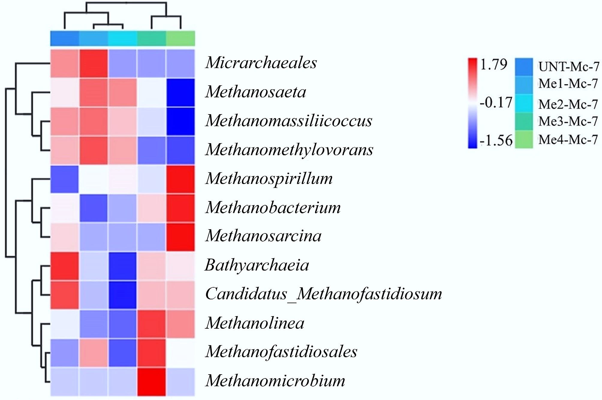 The main body of the heatmap illustrated the overall changes in expression levels of 12 archaeal taxa across five samples. Four of these archaeal taxa showed high expression in the three samples of UNT-Mc-7, Me1-Mc-7, and Me2-Mc-7, while displaying low expression in the Me3-Mc-7 and Me4-Mc-7 samples. When considering the methane production performance of all sample groups on day 7, it could be inferred that these four archaeal taxa collectively formed a methanogenic network during the methanogenic stage of the AD process, with a synergistic and complementary relationship. The addition of melanoidins influenced the metabolic functions of methanogenic archaea, and experimental results indicated biological toxicity. The clustering analysis of archaeal relative abundance among samples (upper dendrogram) revealed that Me3-Mc-7 and Me4-Mc-7 (high-dose) samples were similar in archaeal relative abundance levels. In contrast, Me1-Mc-7 and Me2-Mc-7 (low-dose) samples showed similarity in archaeal functional expression. Moreover, the UNT-Mc-7 sample was closer to the low-dose groups in the clustering, suggesting these two groups shared similar archaeal community structures. Additionally, there were significant differences in how low- and high-dose melanoidins affected the archaeal community during the AD process, which was clearly reflected in the methane production performance of the respective experimental groups. This further supported the reliability of the samples. The clustering results of archaea (left dendrogram) indicated that Micrarchaeales, Methanosaeta, Methanomassiliicoccus, and Methanomethylovorans shared similar relative abundance distribution patterns across all samples.