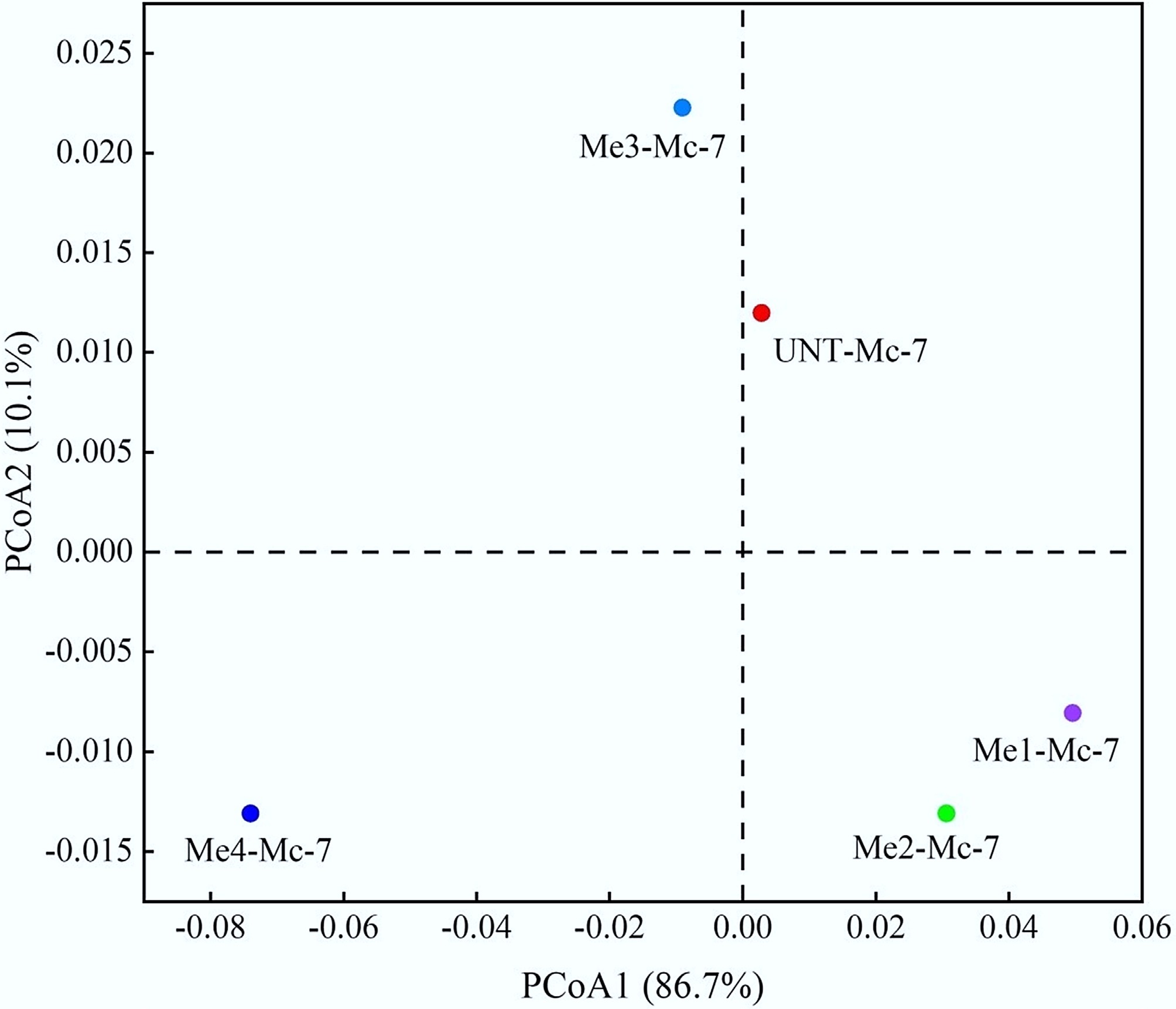 Sample Observed_species Chao1 Shannon UNT-Mc-7 127 127.35 1.76 Me1-Mc-7 111 111.00 1.74 Me2-Mc-7 89 90.88 1.65 Me3-Mc-7 129 129.00 1.80 Me4-Mc-7 88 89.67 1.62 Further beta diversity analysis was conducted on day 7 samples from the melanoidins-treated groups, with the results presented in Fig. 9. PCoA1 and PCoA2 together explained 96.80% of the variation in archaeal community composition. The distribution of sample points indicated that melanoidins addition significantly altered the archaeal community structure. The proximity of points in the low-dose groups suggested a degree of similarity among them. In contrast, the greater separation observed between the high-dose groups indicated that while both groups exhibited a similar level of inhibition on methanogenic performance, the underlying archaeal communities responsible for this effect were distinctly different.