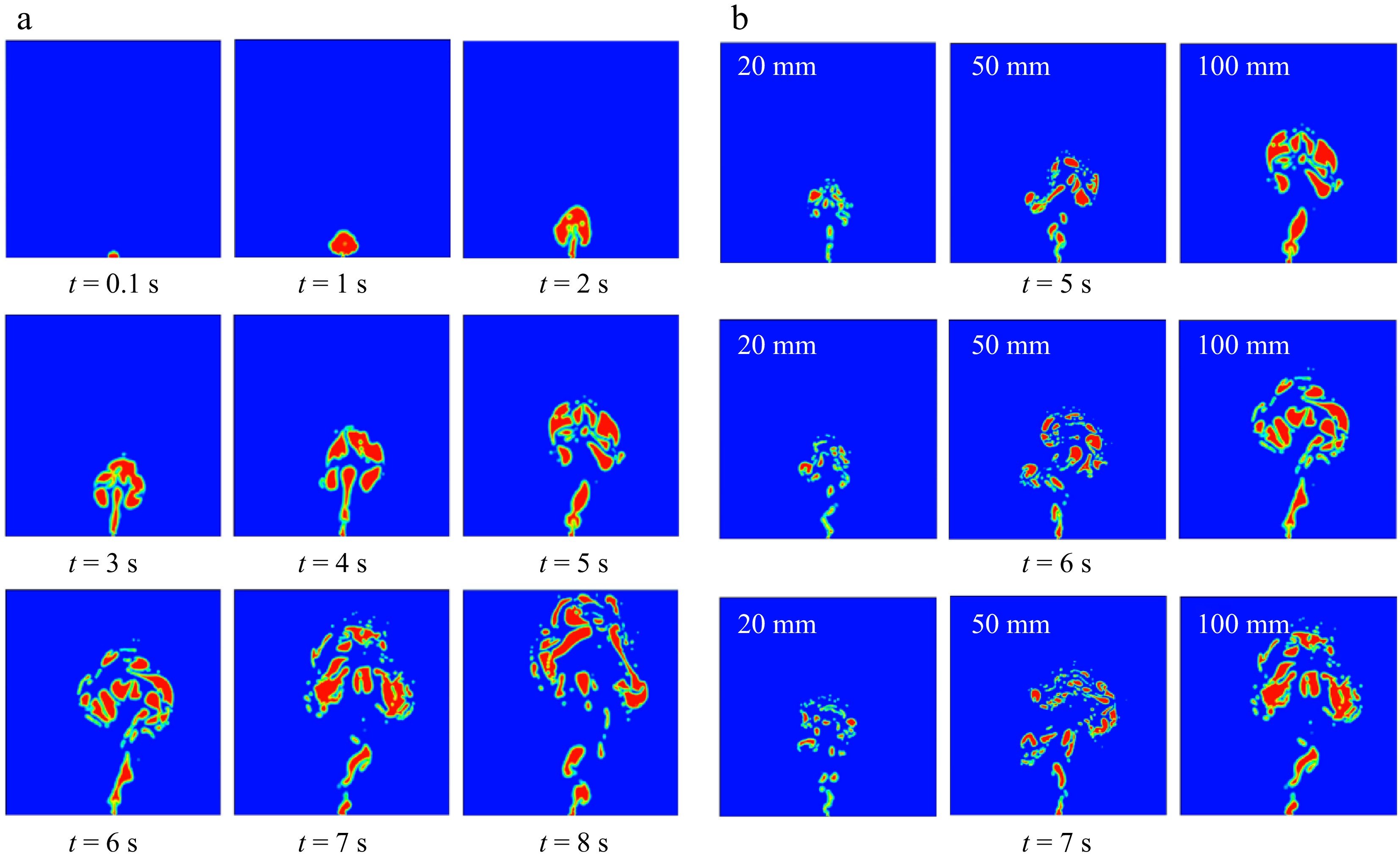 Researchers primarily employed two methods-numerical simulation and experimental techniques to conduct their investigation. Yang et al.[59] employed numerical simulations to explore the effects of factors such as water depth at the leak point, diameter of the leak orifice, leak pressure, and ocean current speed on the consequences of subsea CH4 pipeline leakage and diffusion. Their study revealed that when CH4 enters the seawater, it forms a gas cloud that rises continuously due to the pressure inside the pipeline and the buoyancy of the seawater. As more CH4 is released, it disturbs the seawater, causing the gas cloud to gradually assume a mushroom shape. However, as a result of the interaction between the gas and liquid phases, the gas cloud eventually breaks into smaller bubbles that float and spread towards the sea surface. The conclusion of this study is similar to that of Zhang et al.[36], who found that the leakage bubbles form a conical structure from the release point to the water surface, and both the leak hole diameter and leak pressure have a significant impact on the radial diameter of this conical structure. Furthermore, Chai et al.[60] discovered that as the gas cloud nears the sea surface, the decreasing pressure in the seawater makes it more challenging for the gas to accumulate, leading to the fragmentation of the gas cloud into smaller pieces. Additionally, Yang et al.[59] found that the higher the pipeline pressure, the quicker the gas will reach the surface. The deeper the leak orifice, the longer it takes for the CH4 to reach the surface. An increase in the diameter of the leak orifice also leads to a higher amount of CH4 being released, as well as an increased ascent velocity and a wider spread towards the surface (Fig. 10). Ocean current speed primarily influences the lateral movement of the leaked gas in the direction of the water flow; the faster the current, the further the CH4 is transported from the leak orifice to the sea surface. The conclusion of this study is consistent with the findings of Ji et al.[21]. In addition, Ji et al.[21] also found that at lower natural gas leakage rates, the effect of the current on the lateral diffusion of gas is significantly greater than at higher leakage rates.