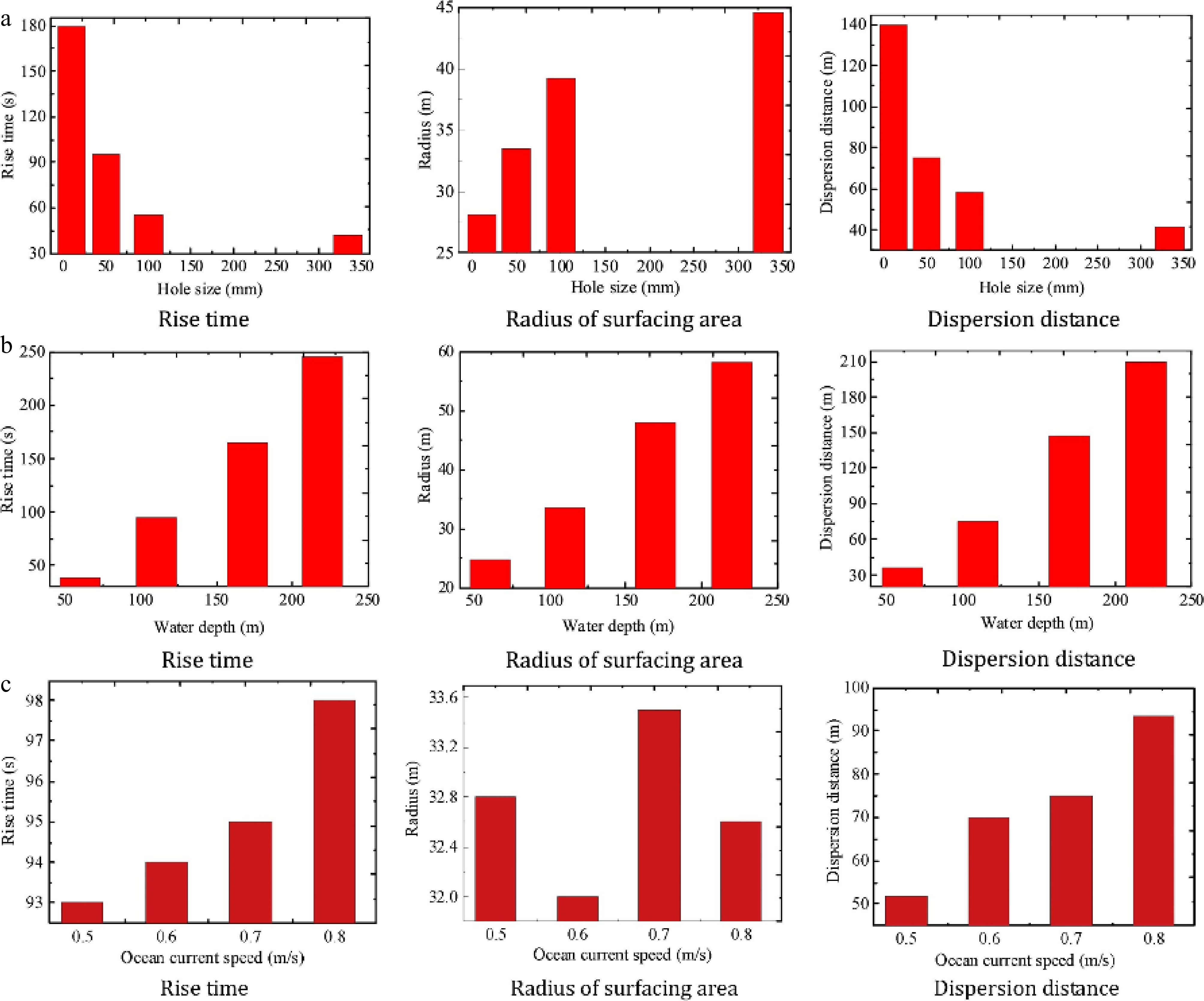 In subsea scenarios, critical factors influencing the diffusion of combustible gases include the water depth at the leak point, the size of the leak orifice, the pressure of the leak, and the speed of ocean currents. The larger the orifice size and the higher the leak pressure, the more rapidly the gas will diffuse to the surface, resulting in an expanded diffusion range. The time required for diffusion is directly proportional to the water depth at the leak site. Moreover, both the ascent time and the horizontal spread distance increase with the speed of the ocean currents. However, the size of the diffusion area changes irregularly in response to varying current speeds. Additionally, different leakage conditions can impact the combustion behavior of the gas once it reaches the surface.