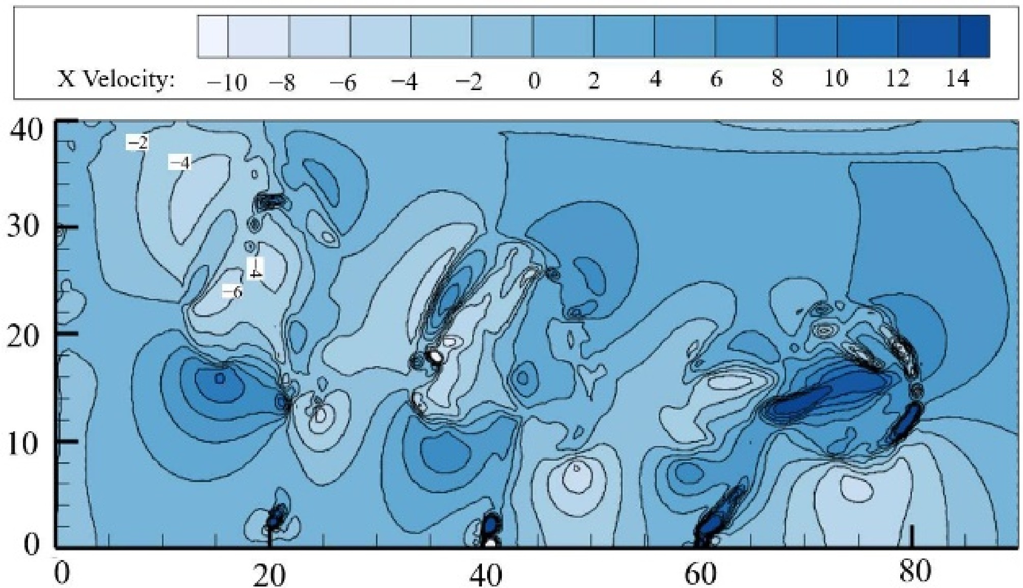 Ji et al.[21] conducted a numerical simulation study on the impact of multiple underwater leak orifices on the consequences of leakage. The research found that when the leak orifices are arranged along the direction of the ocean current, the strong turbulent motion at the upstream leak orifice due to the interaction between several orifices leads to an increase in the horizontal component of the seawater velocity. This horizontal kinetic energy affects the horizontal velocity of the gas cloud leaking from the downstream orifice, thereby increasing the diffusion range of the CH4, as shown in Fig. 12.