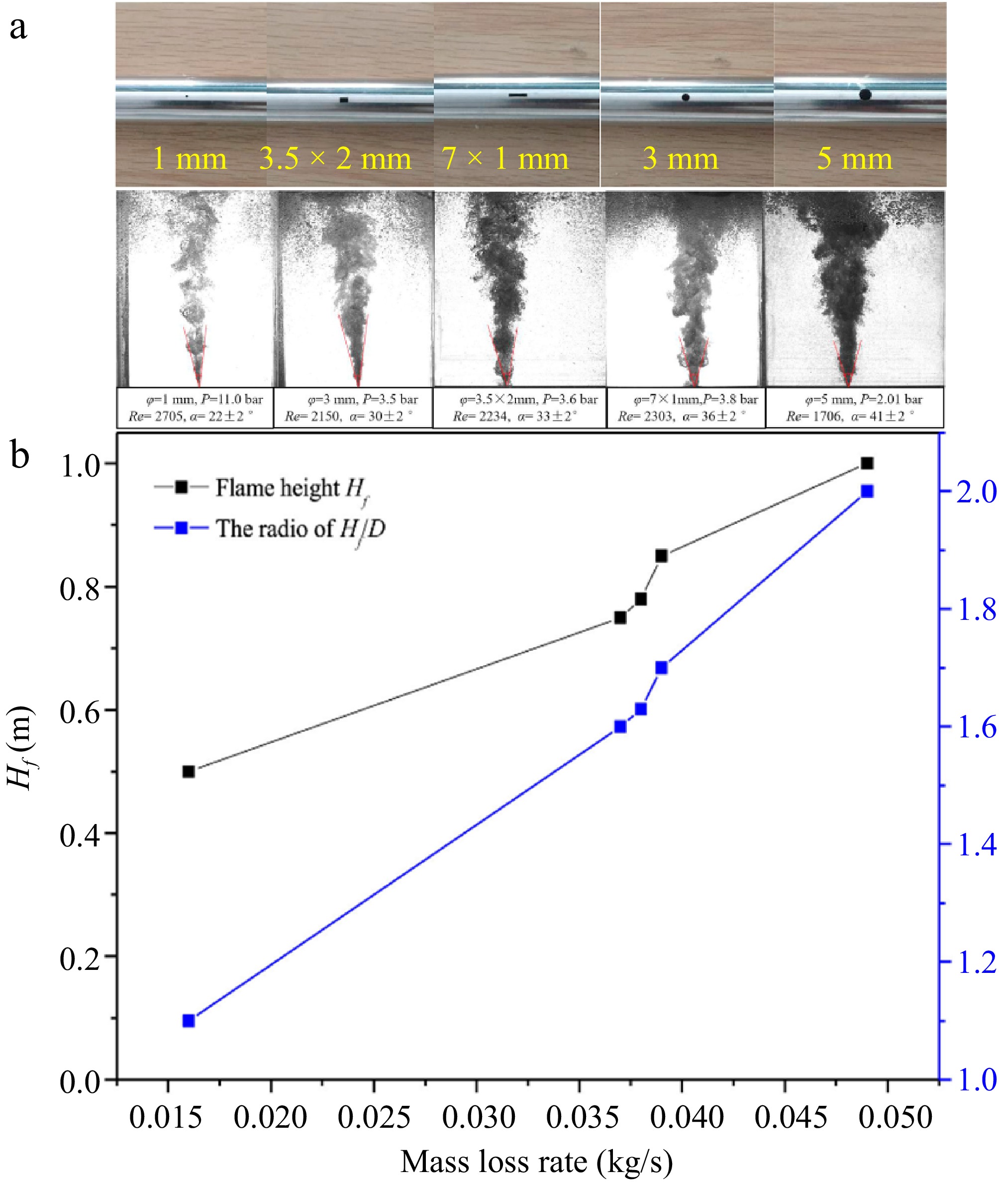 (a) Different leakage apertures and their leakage gas jet states. (b) Flame height and Hf/D along with the change of mass loss[67].