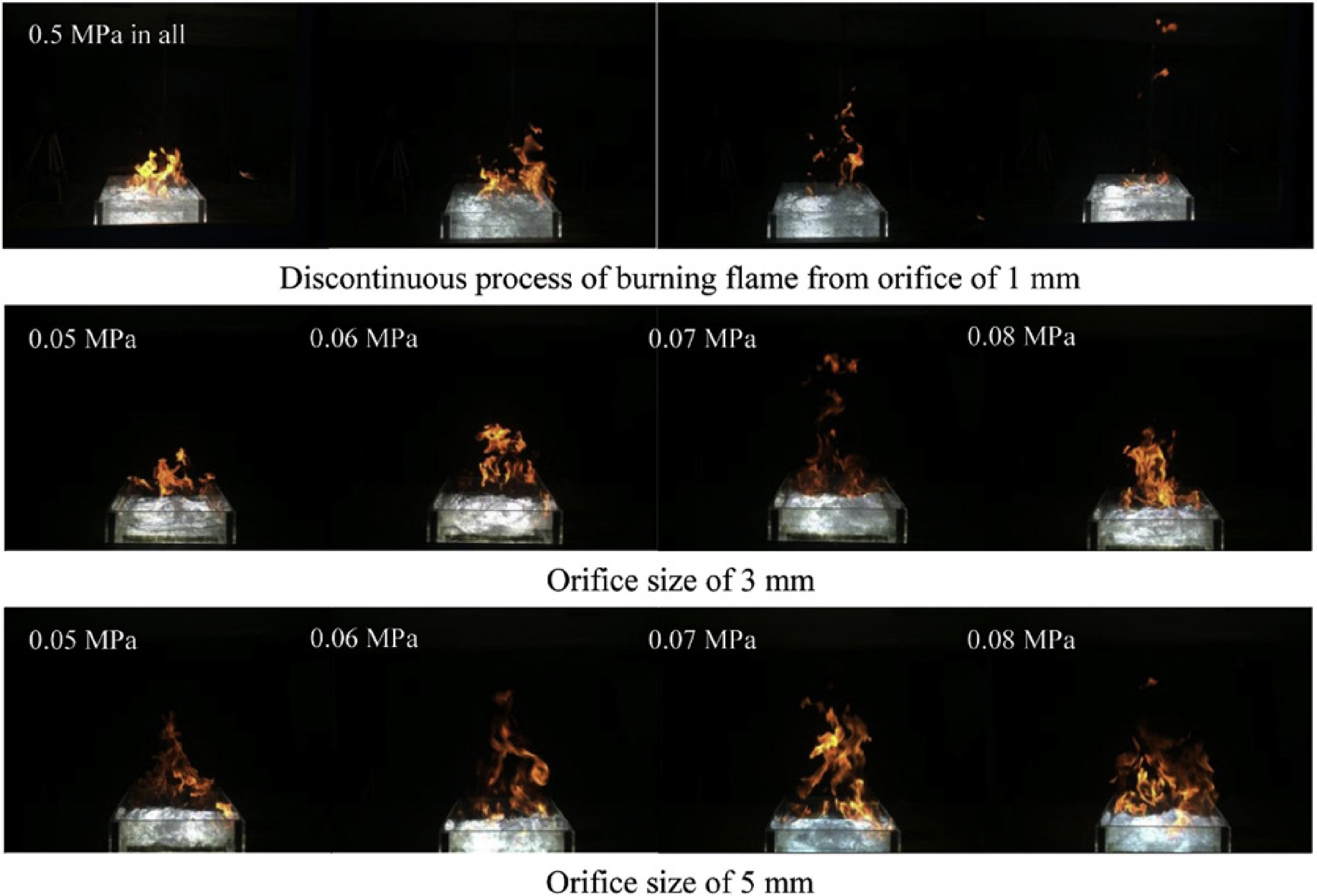 CH4 burns a flame on the water surface after leaking at different apertures and pressures[22].