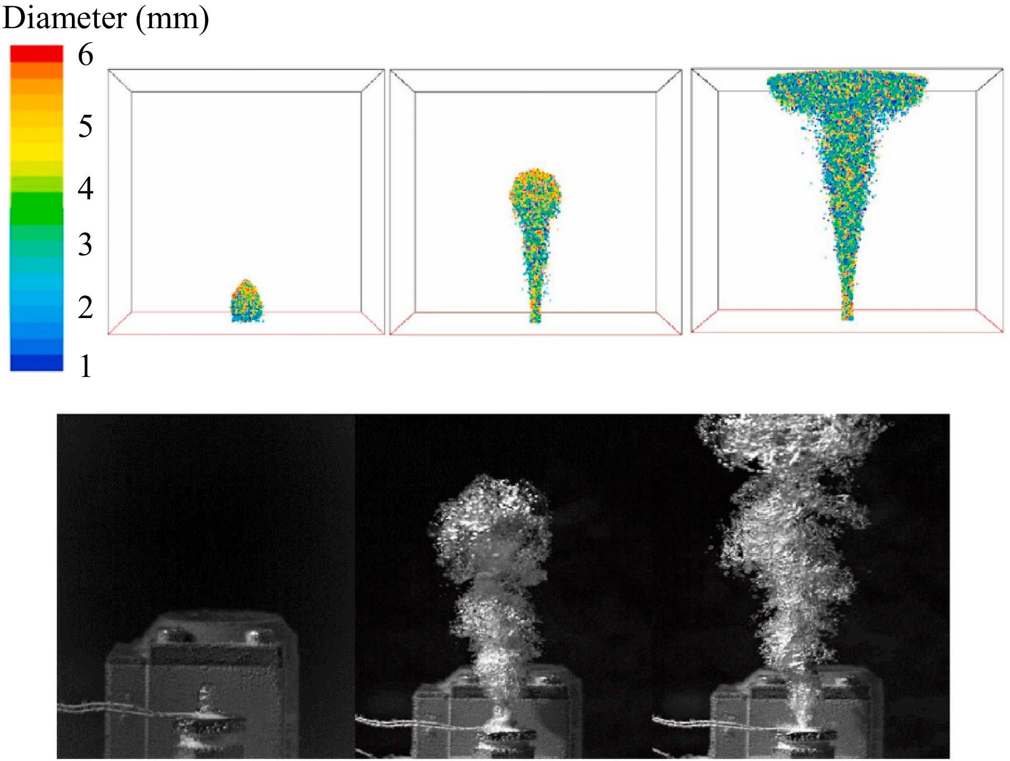 Liu et al.[65] used experimental methods to examine the evolution of bubble plumes formed by CH4 leaks underwater. Their results showed that the plume radius increases with higher pressure, deeper water, and larger leak orifice diameters. This occurs because an increase in the leak orifice diameter and leak pressure boosts the initial flow rate and the kinetic energy of the gas leakage. Furthermore, the deeper the leak point, the longer the gas takes to diffuse, all of which lead to an increase in the bubble radius, as illustrated in Fig. 15.